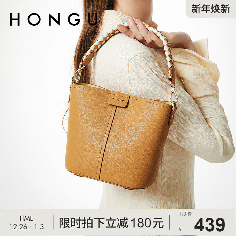 红谷包包女士新款牛皮时尚单肩水桶包百搭大容量斜挎手提包女包