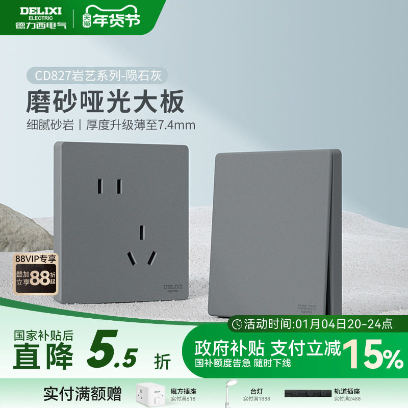 德力西旗舰店827开关插座哑光空调16A磨砂面板一开五孔暗装插座灰