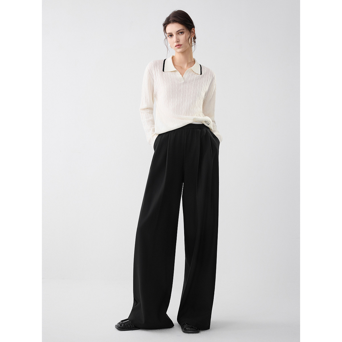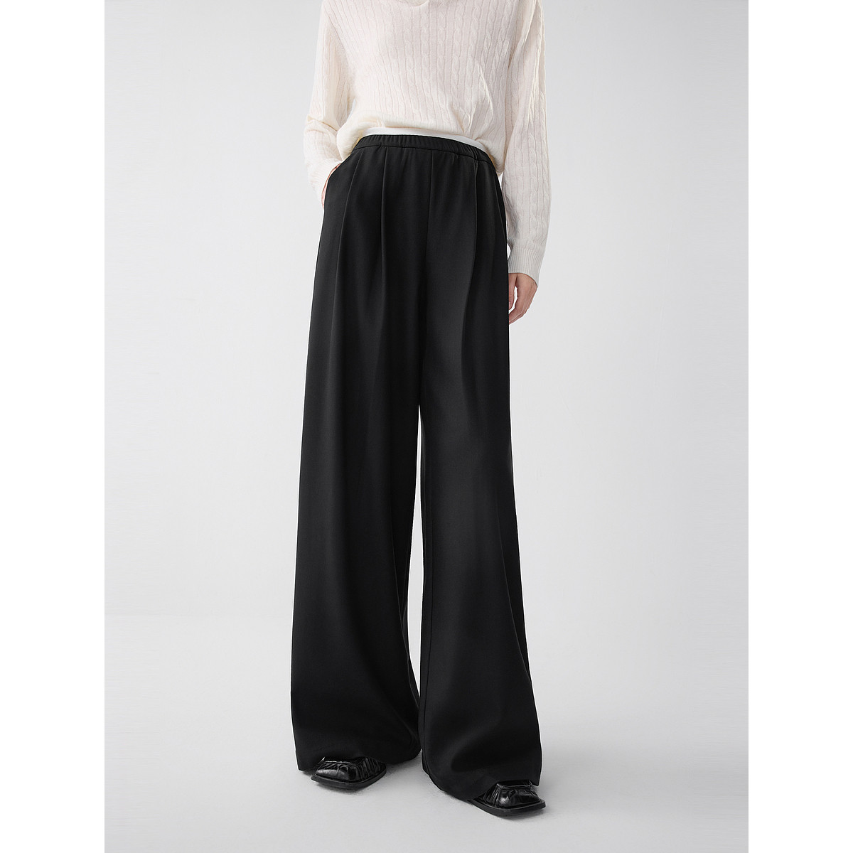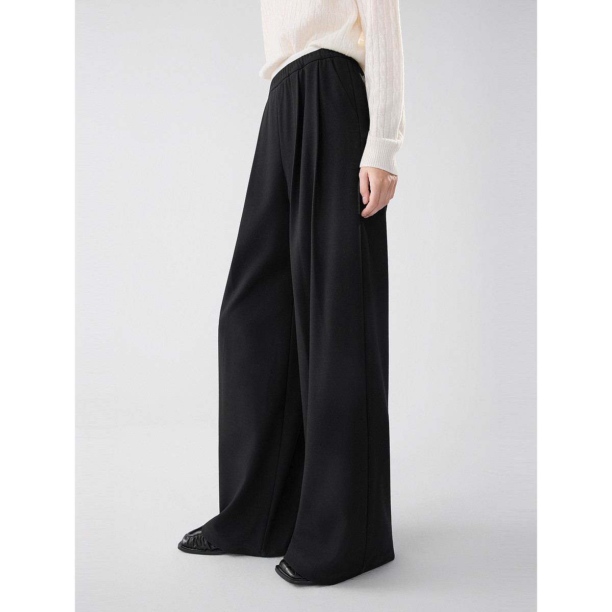ELLE黑色绵羊毛松弛感休闲裤女2025冬新款高腰显瘦牛筋腰阔腿裤子