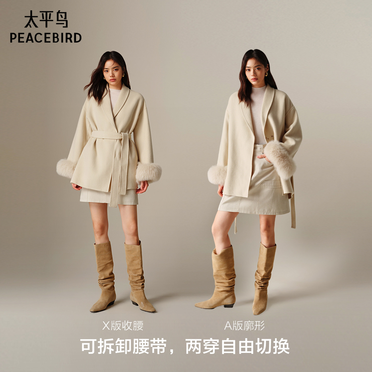 太平鸟甄毛系列收腰浴袍大衣全羊毛双面呢大衣女可脱卸狐狸毛袖口