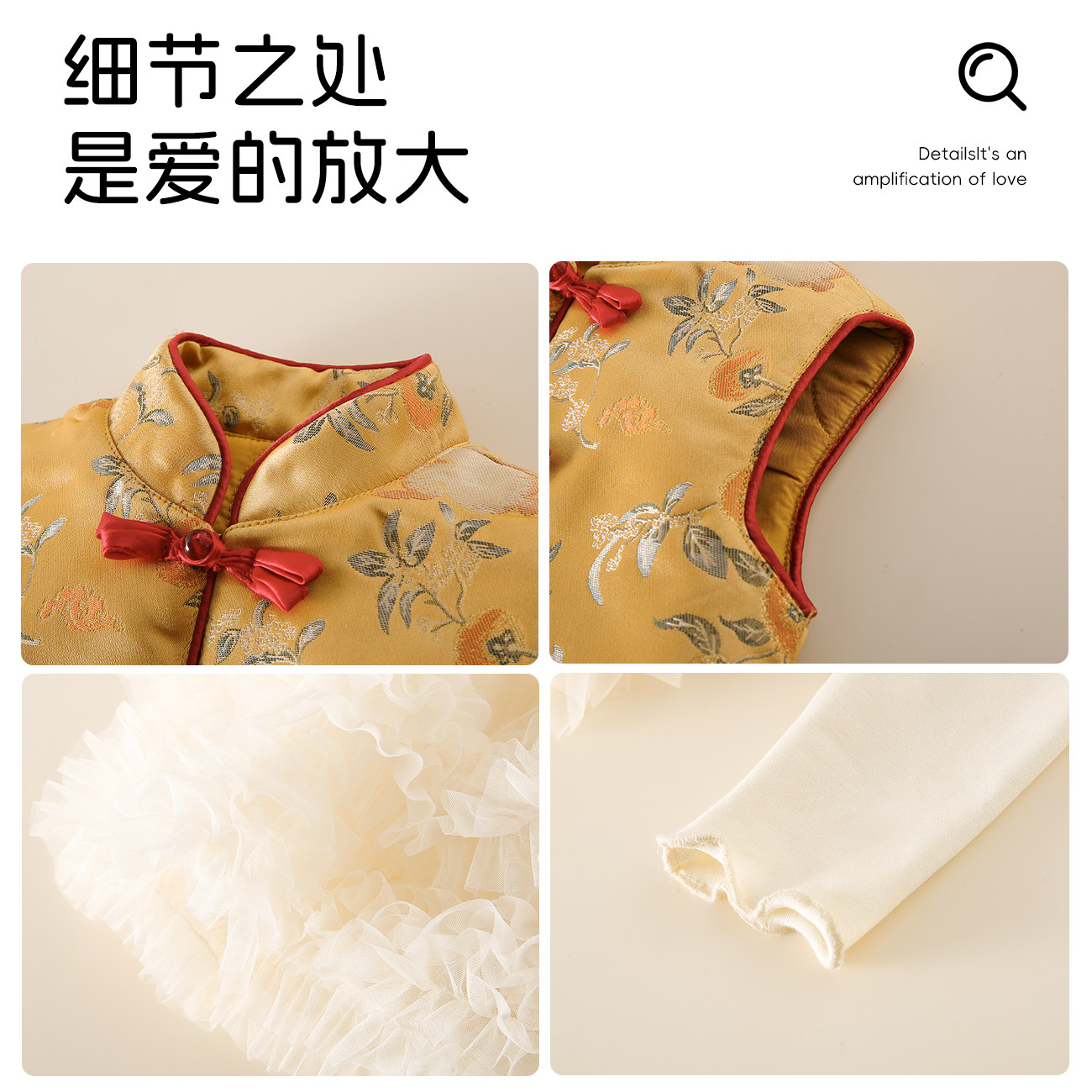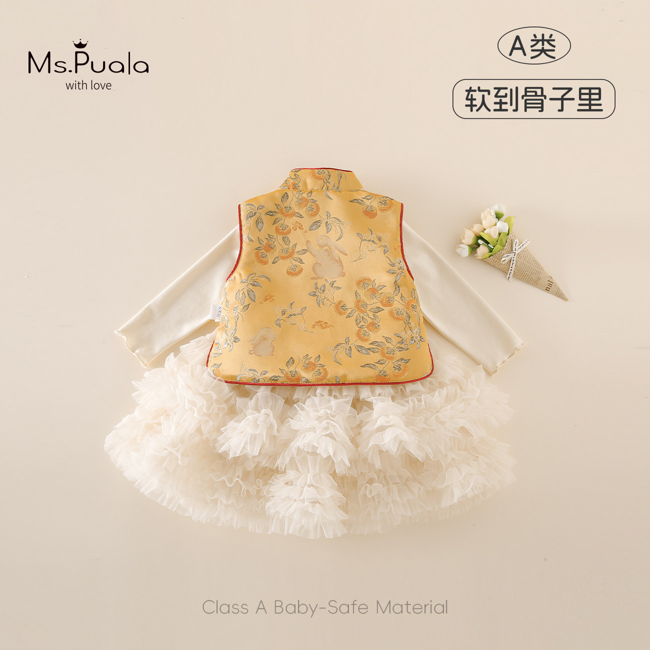 Ms.Puala女童年服套装杏色公主纱裙黄色刺绣马甲女宝宝年服两件套