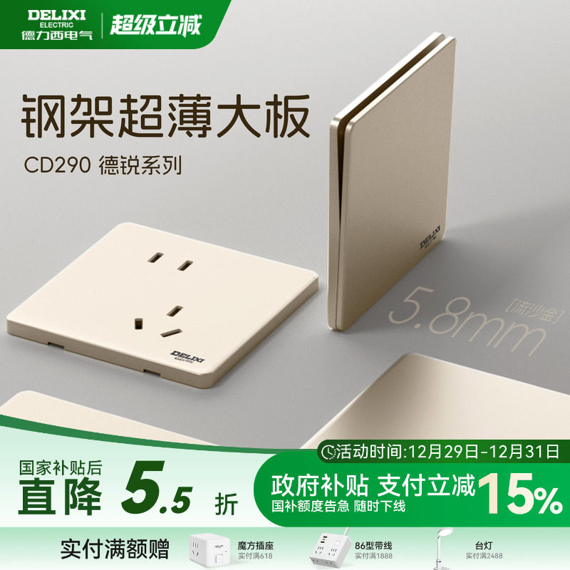 德力西290超薄开关插座面板奶油风空调16a墙壁一开五孔家用流沙金
