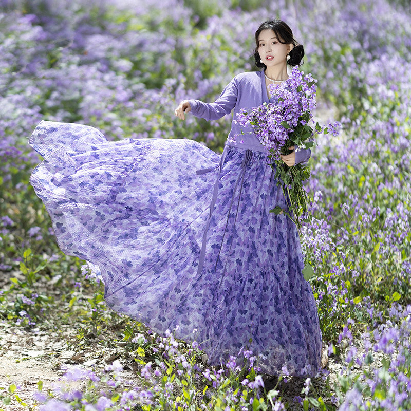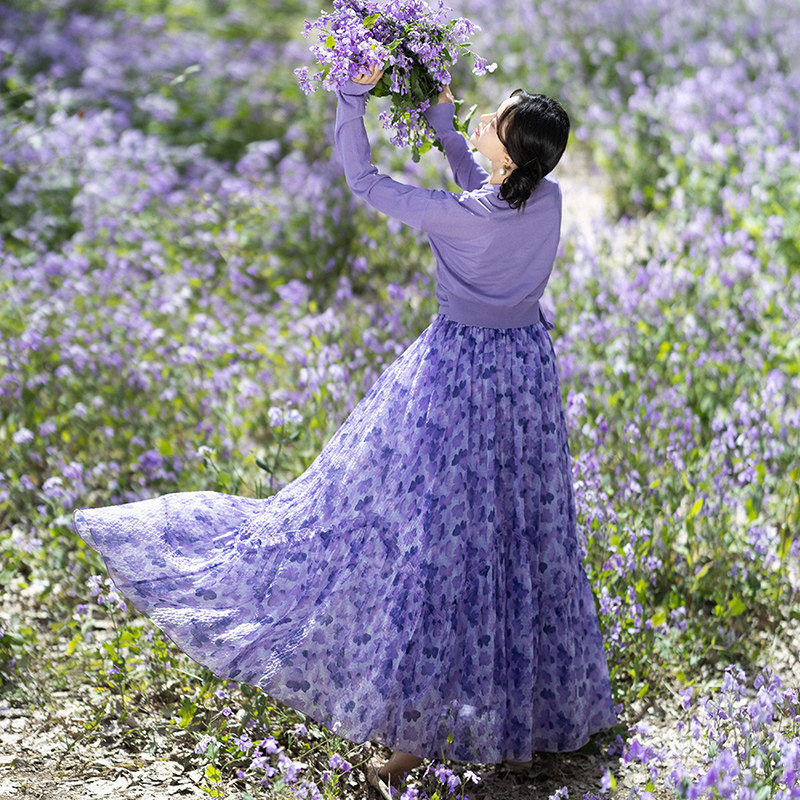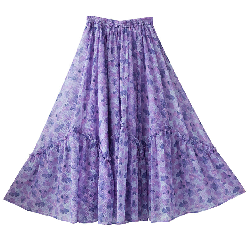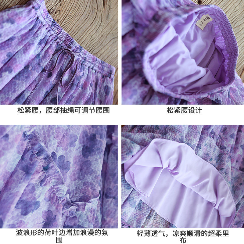 【紫萝藤蔓】复古波浪大摆半身长裙女2025年夏季雪纺印花紫色裙子