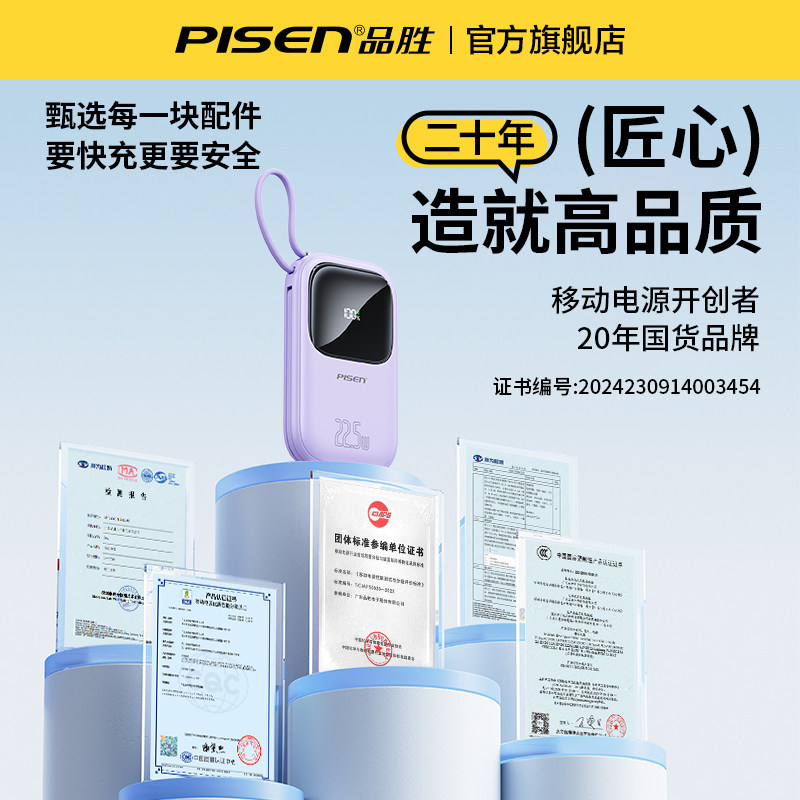 【3C认证充电宝】品胜自带插头20000毫安大容量10000充电器二合一电霸标识自带线适用苹果17小米移动电源
