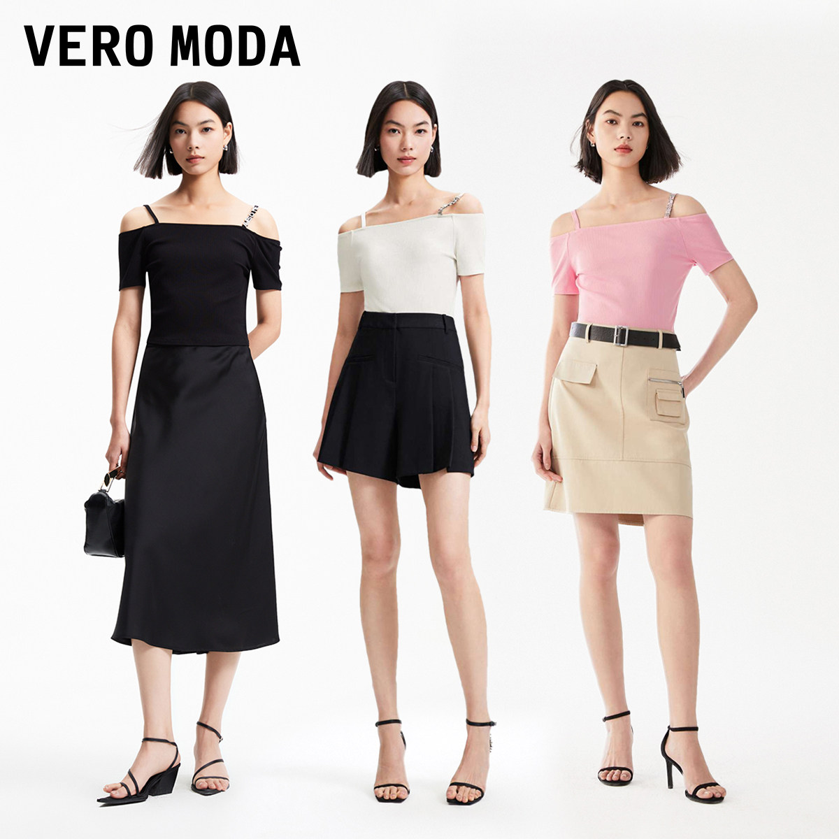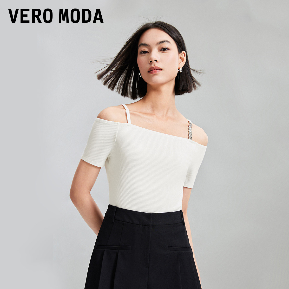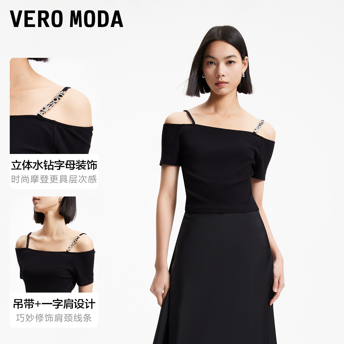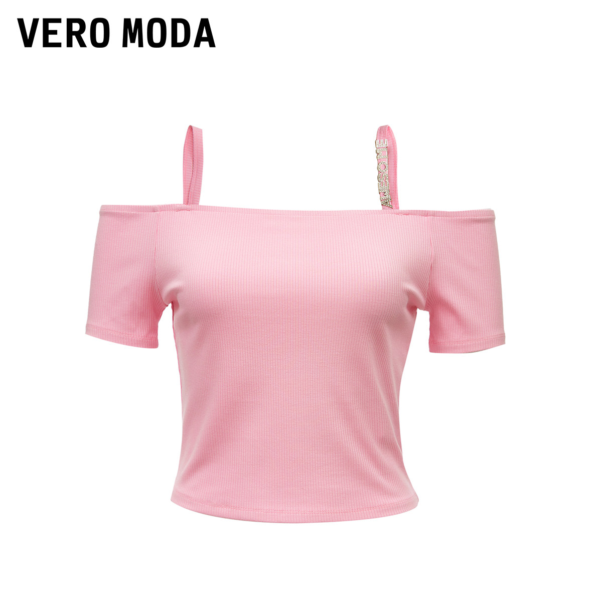 Vero Moda奥莱T恤女夏季新款优雅简约吊带一字肩水钻短袖上衣百搭