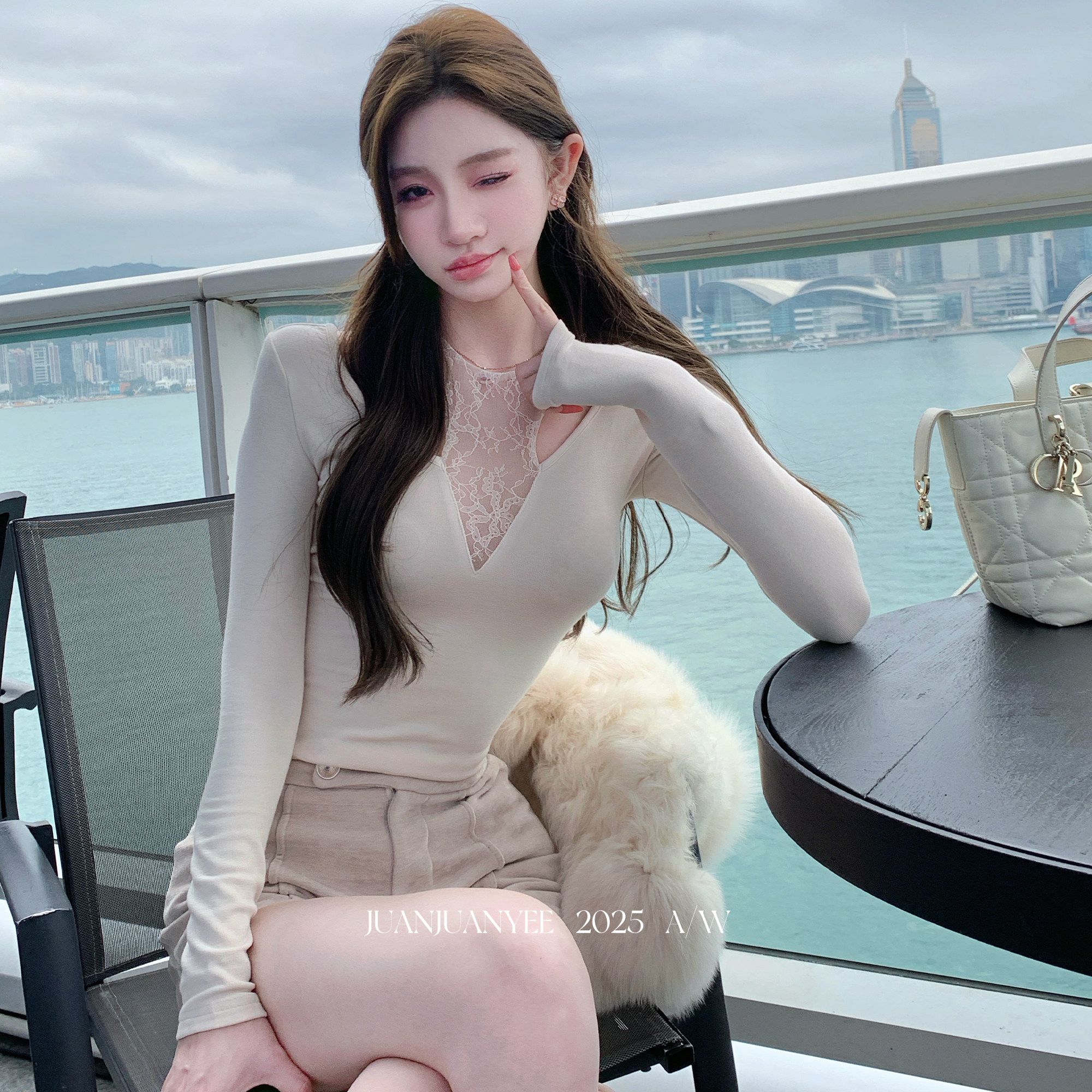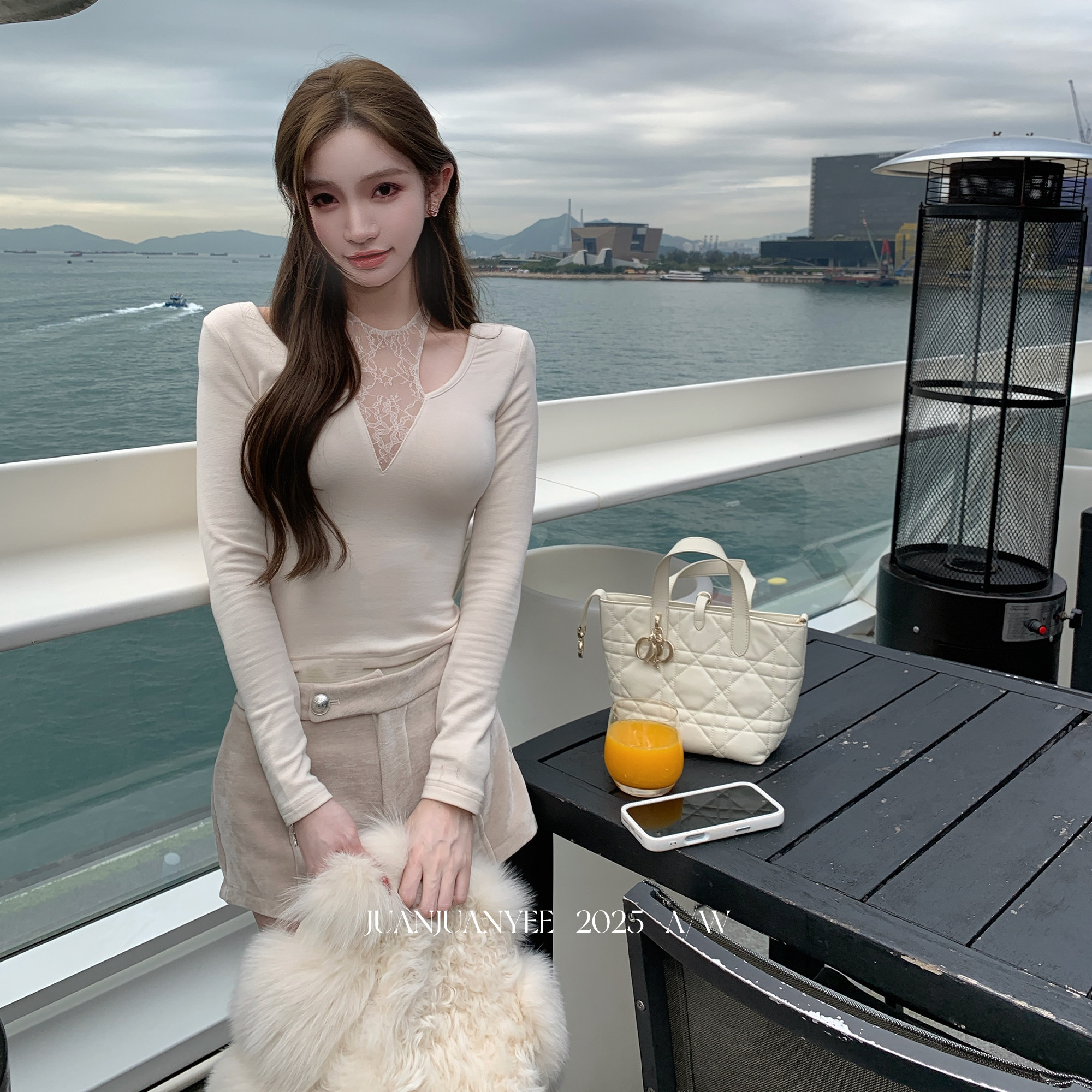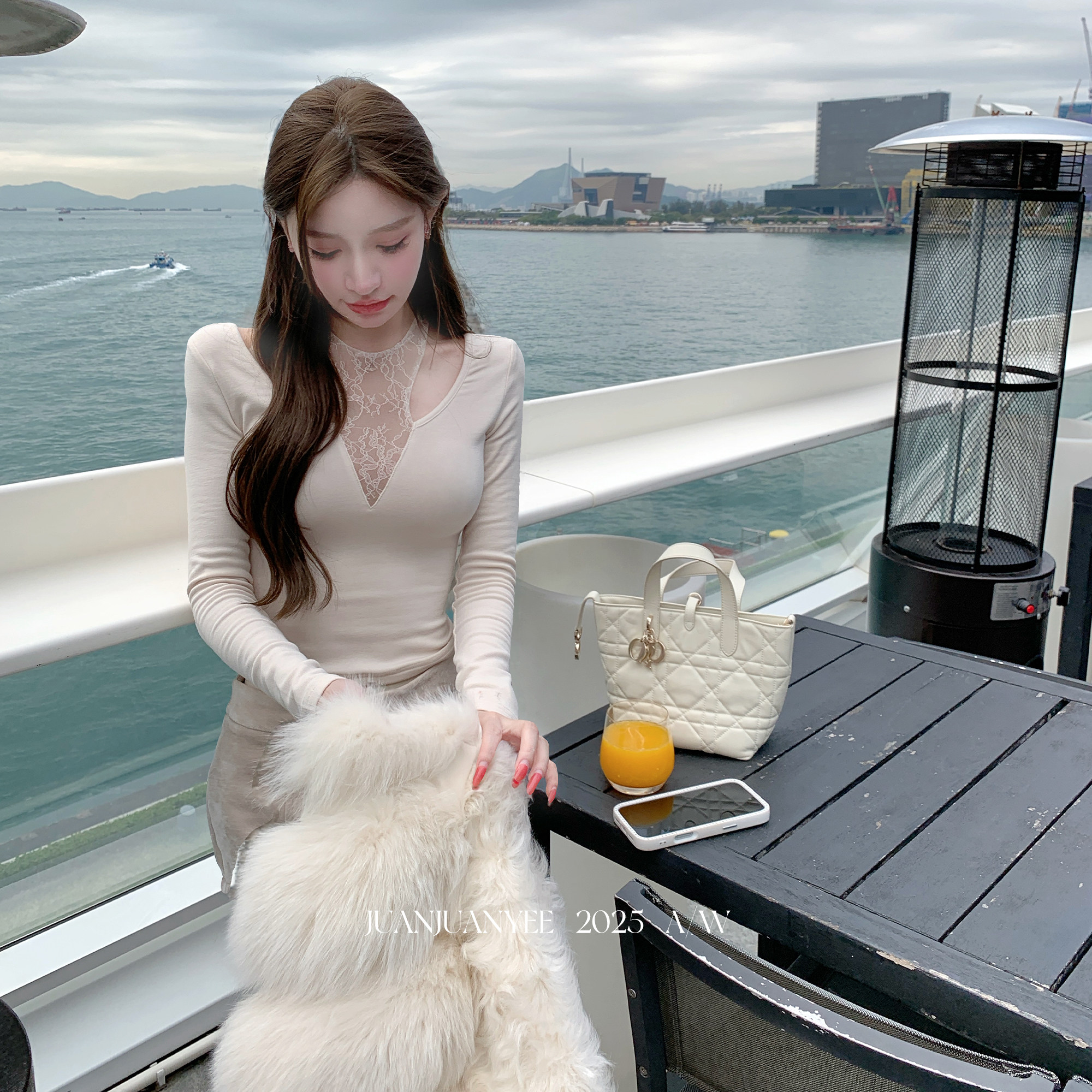 juanjuanyee【纯欲交织】蕾丝镂空挂脖假两件针织衫长袖打底上衣