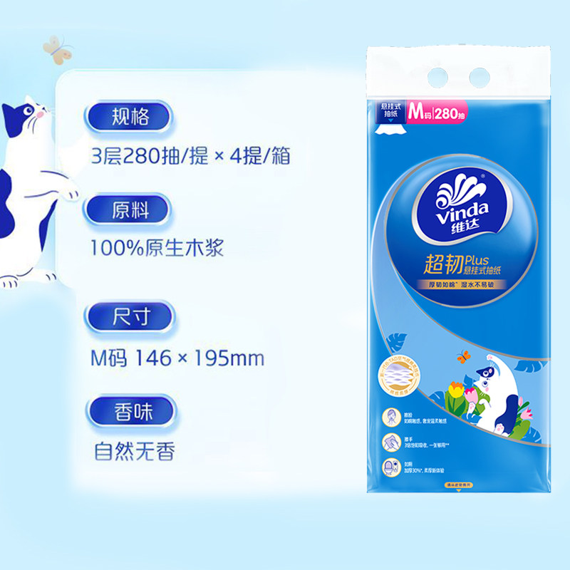 维达悬挂式抽纸280抽M码3层纸巾软抽家用实惠原生木浆超韧年货节