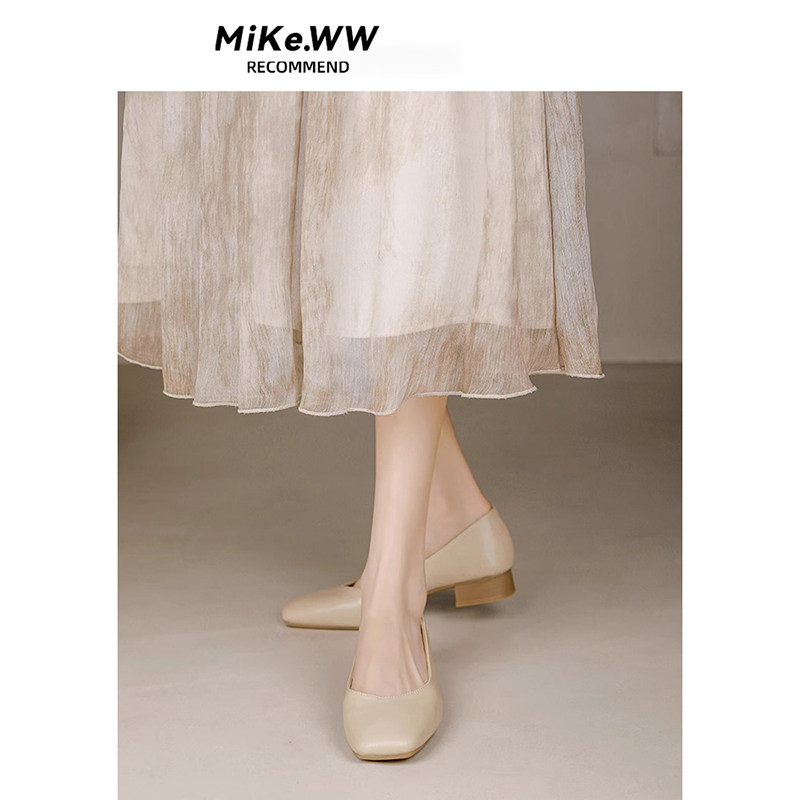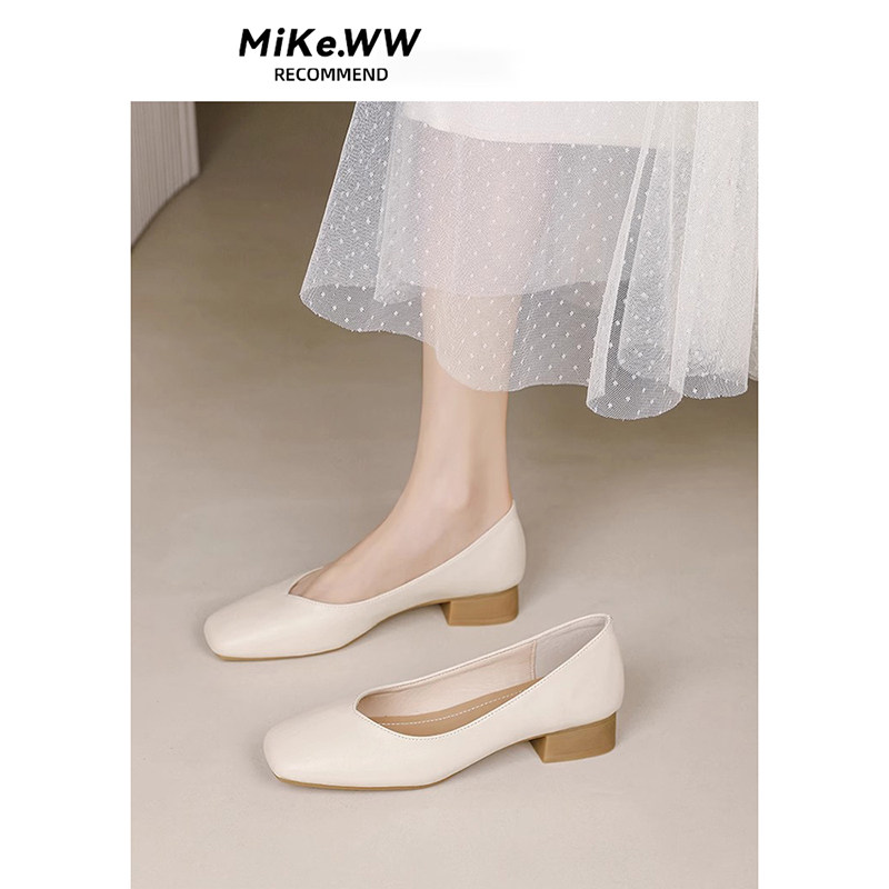 裸色真皮奶奶鞋女粗跟2025年新款法式中跟女鞋夏季软皮不累脚单鞋