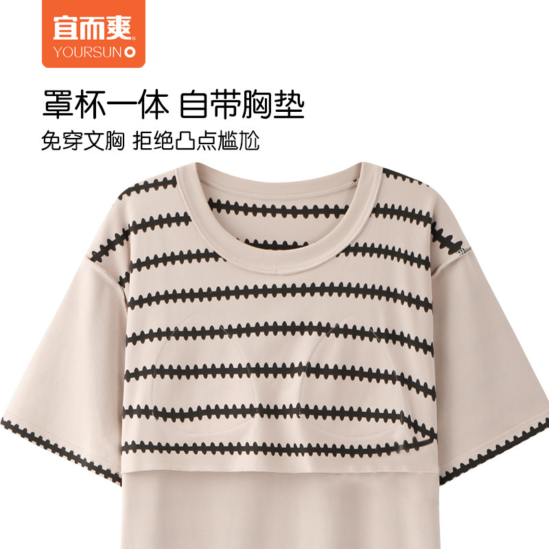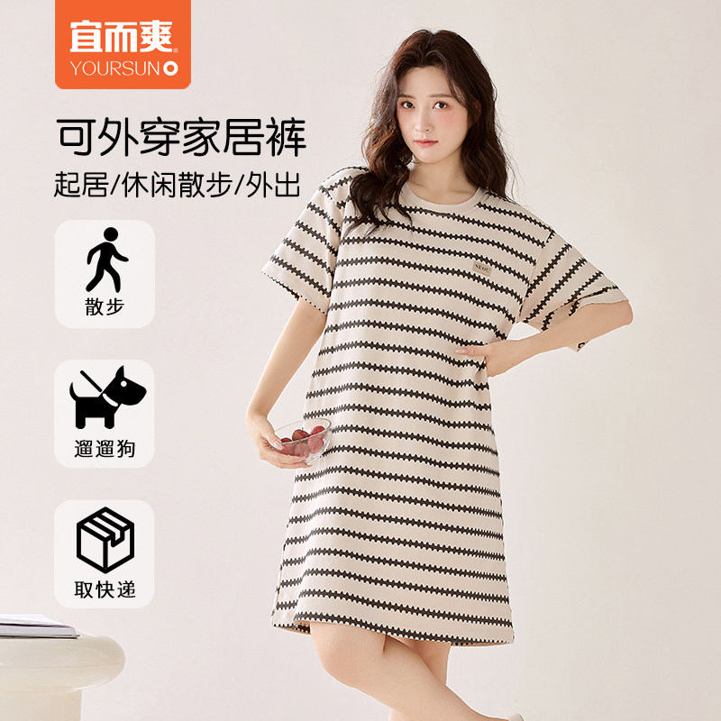宜而爽女士纯棉睡裙100%全棉A类带胸垫家居服条纹宽松中长睡衣夏