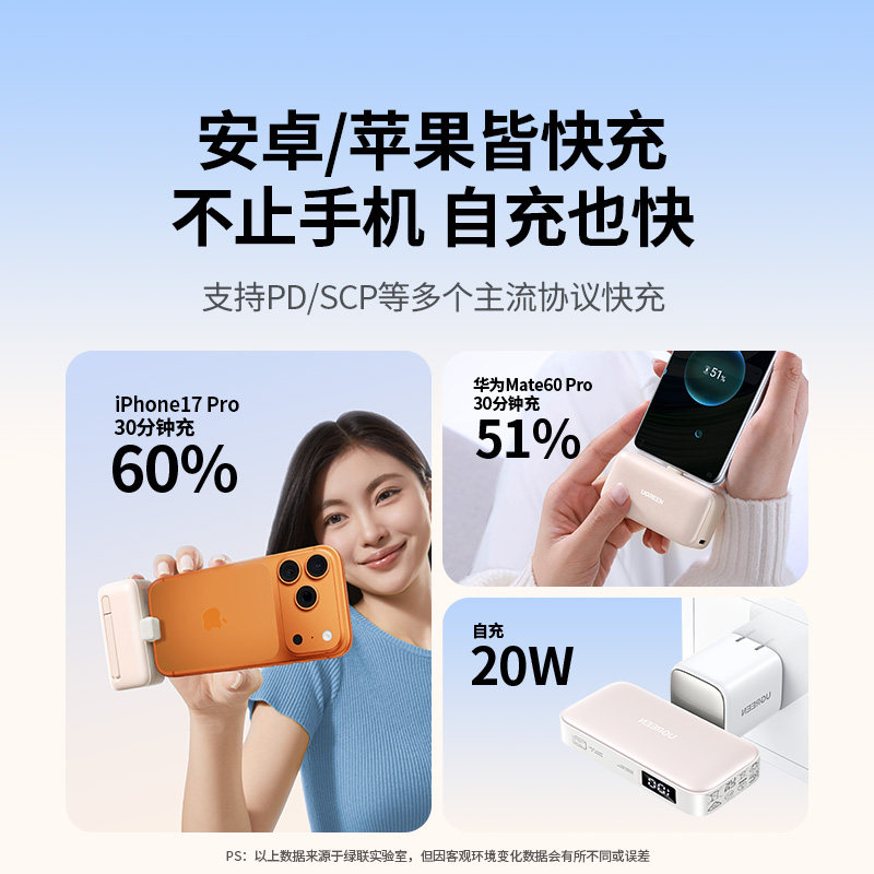 【充电宝3C认证可上飞机】绿联2025新款胶囊充电宝5000毫安小巧便携16适用苹果快充17无线移动电源官方旗舰店