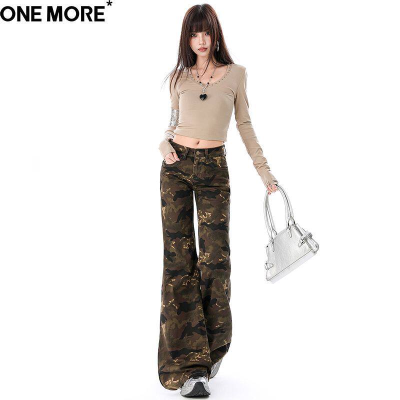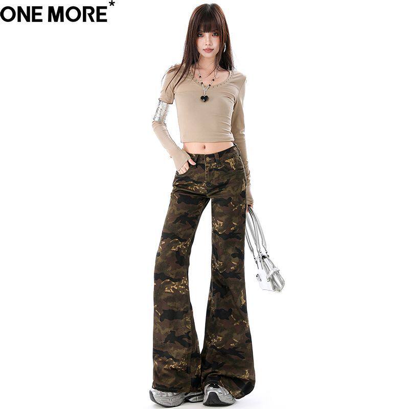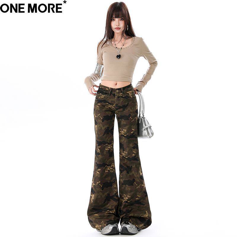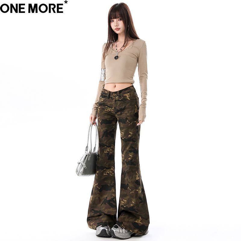 One More美式低腰微喇迷彩牛仔裤女2026春季新款修身显瘦喇叭裤子