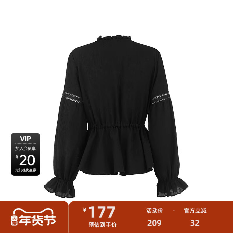 sdeer圣迪奥女装木耳边V领风琴褶收腰镂空花边衬衫S243Z0522