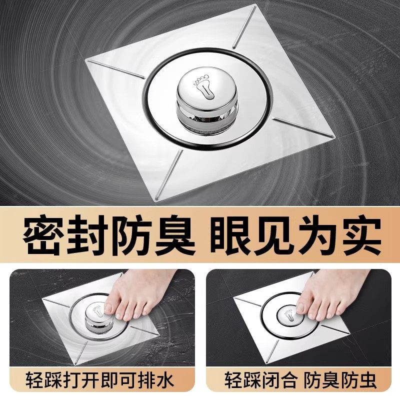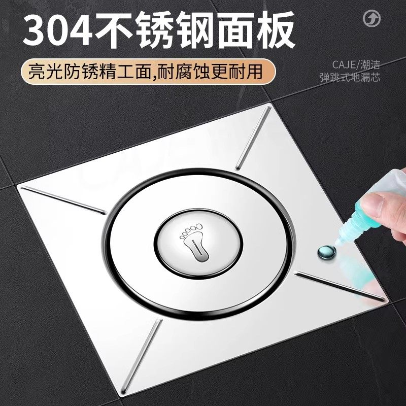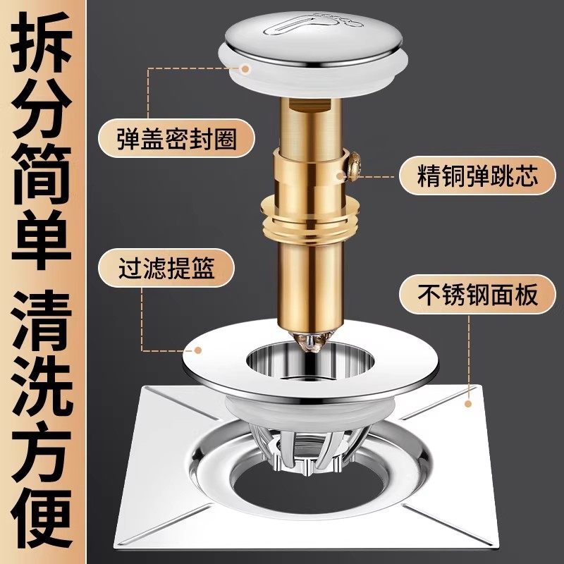 弹跳地漏卫生间防臭器下水道通用防返臭按压地漏盖排水方形全铜