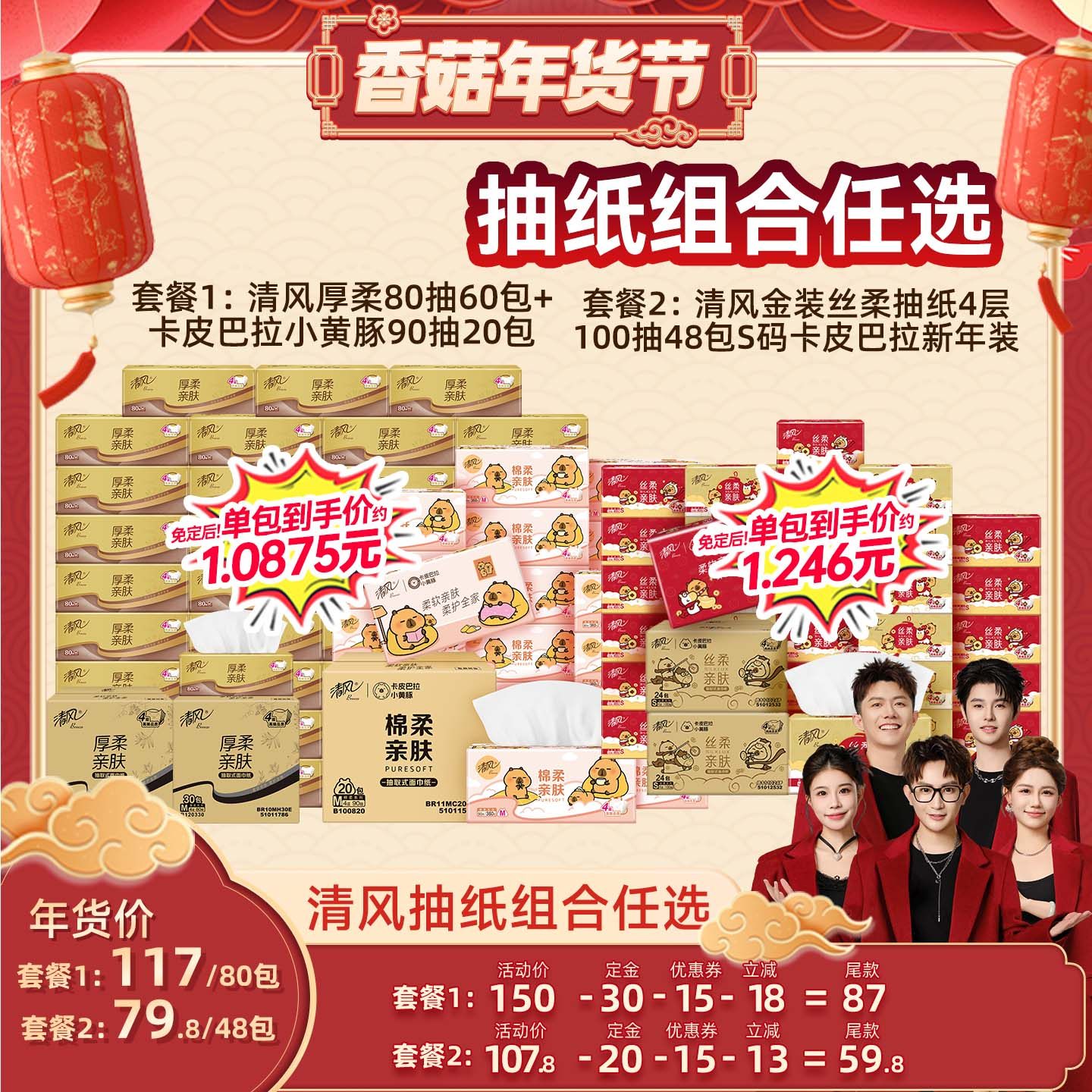【香菇超级年货节】清风抽纸金装80抽60包+卡皮巴拉90抽20包