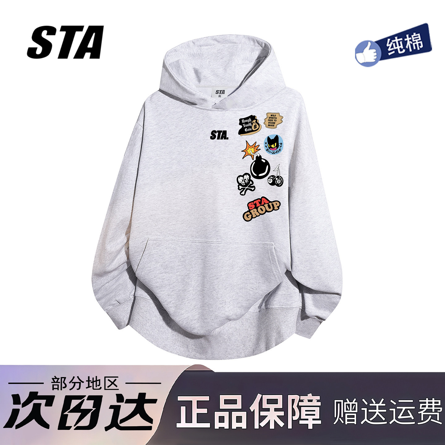 STA旗舰店基础小字母印花连帽卫衣男女美式潮牌重磅纯棉灰色外套