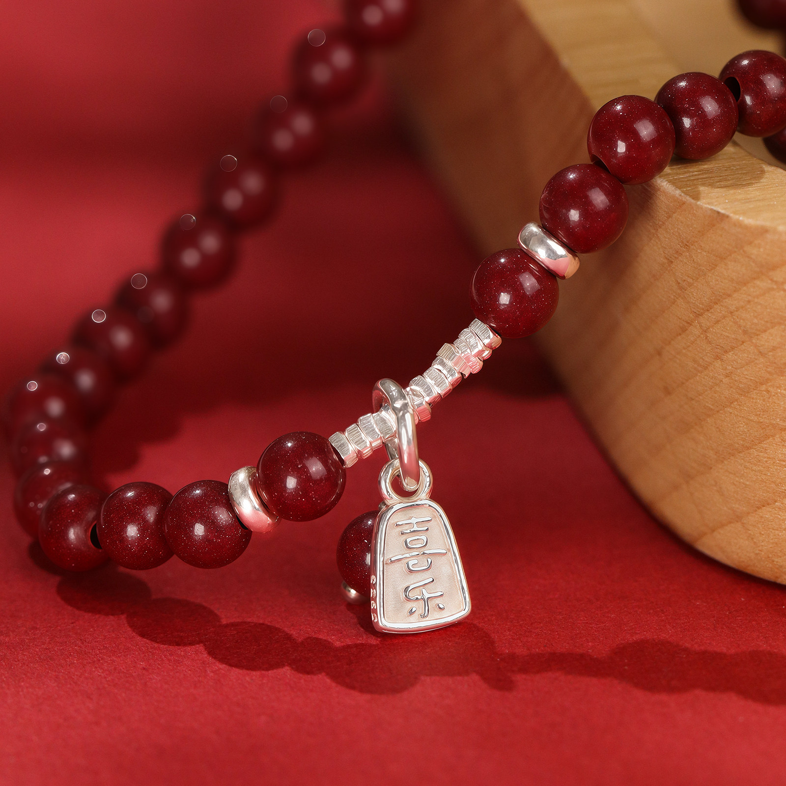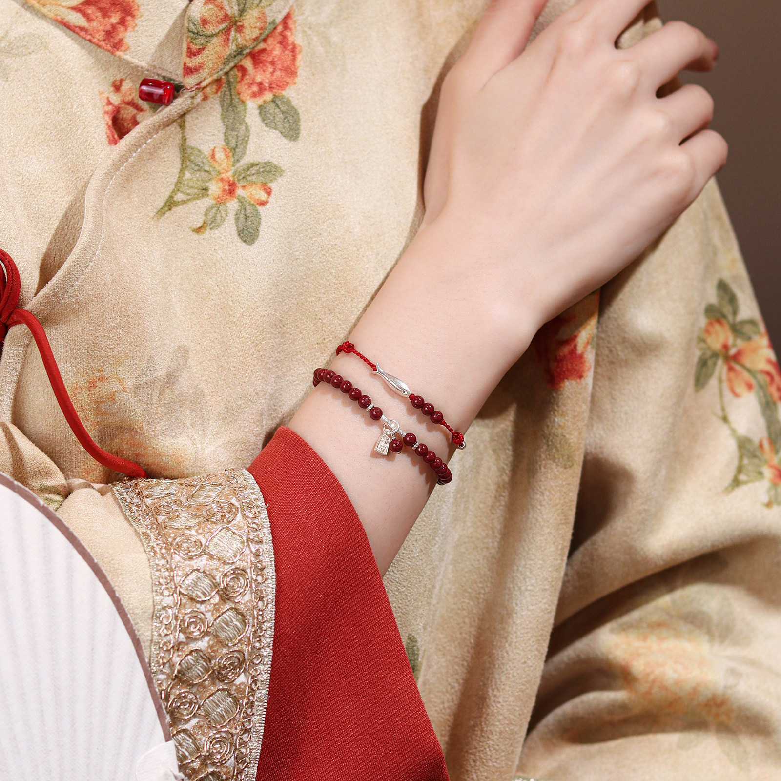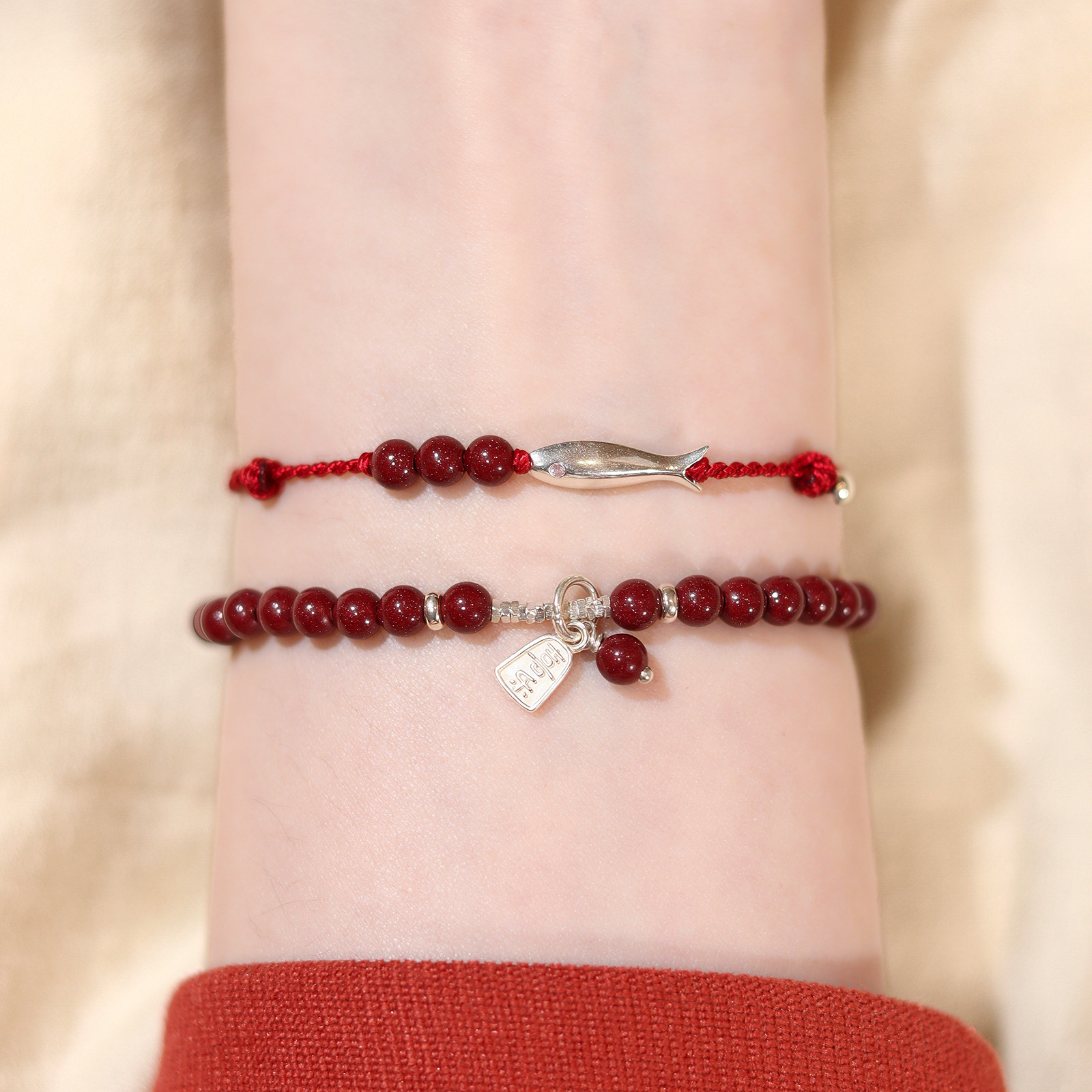 福鱼跃天然朱砂手串正品女款红手绳手链轻奢小众精致叠戴转运碎银