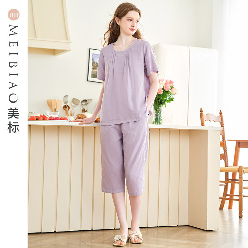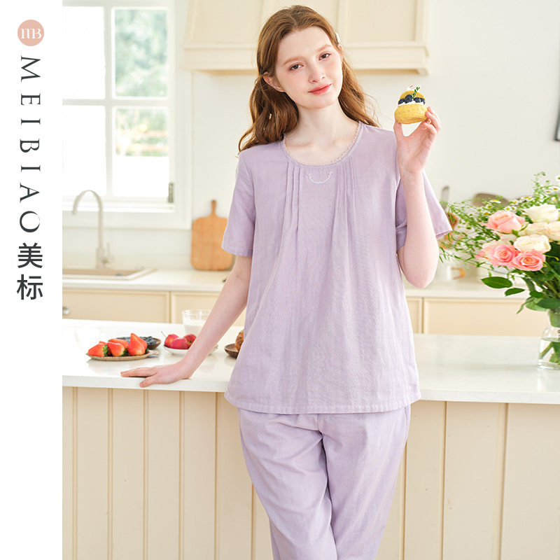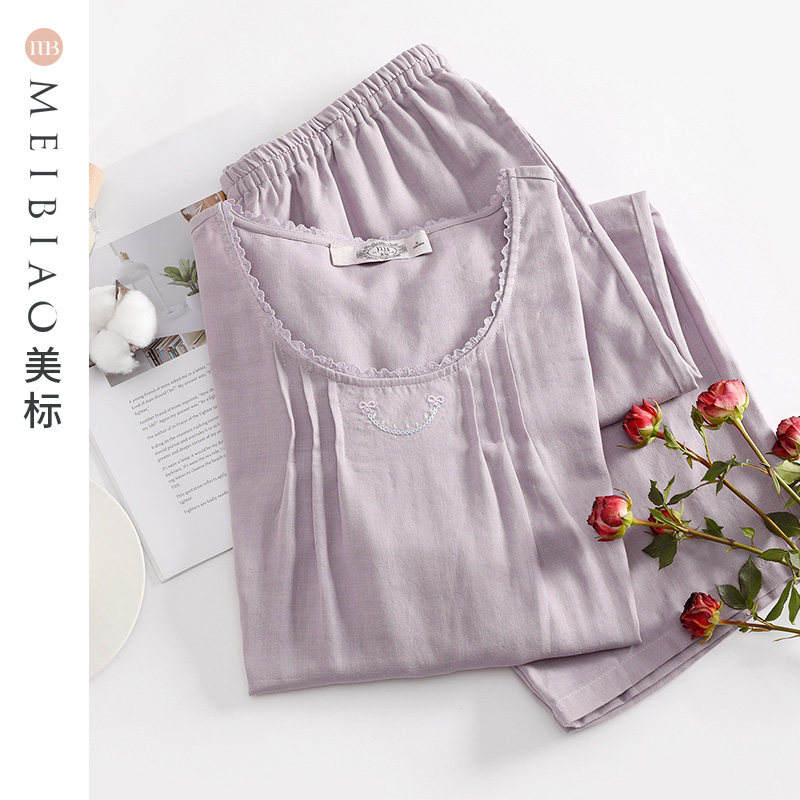 美标新款纯棉睡衣套装女春夏薄款双层棉纱简约休闲蕾丝全棉家居服