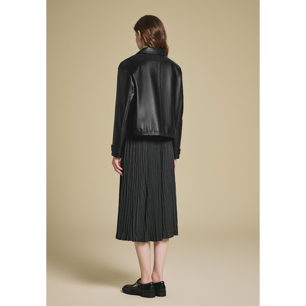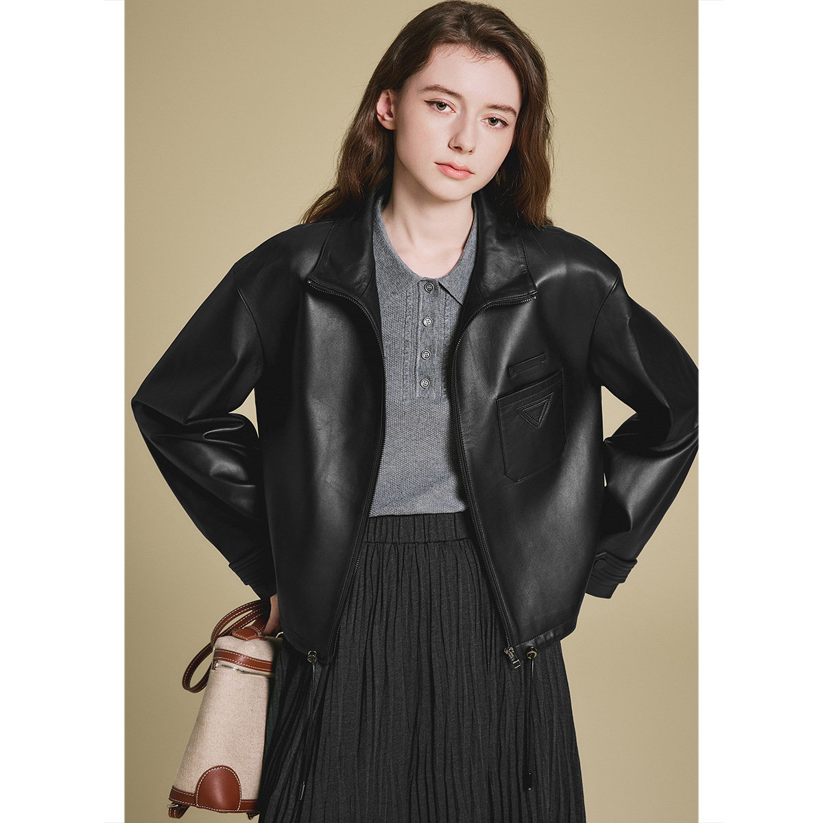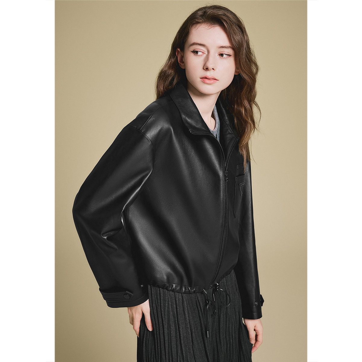 诗篇专选复古巴恩风落肩袖时尚短款夹克皮衣外套2025春款