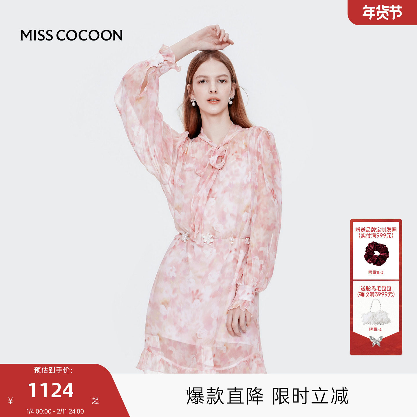 MISSCOCOON可可尼粉色系带碎花连衣裙2025秋季新款度假欧若风裙子