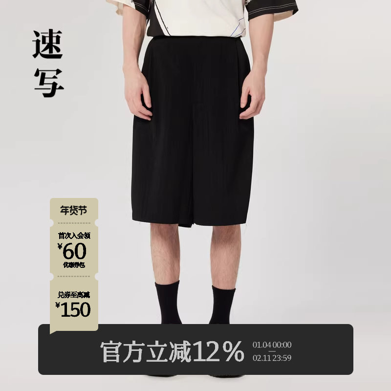 速写男装秋季新款中短裤潮流休闲宽松简约全褶皱设计直筒五分裤
