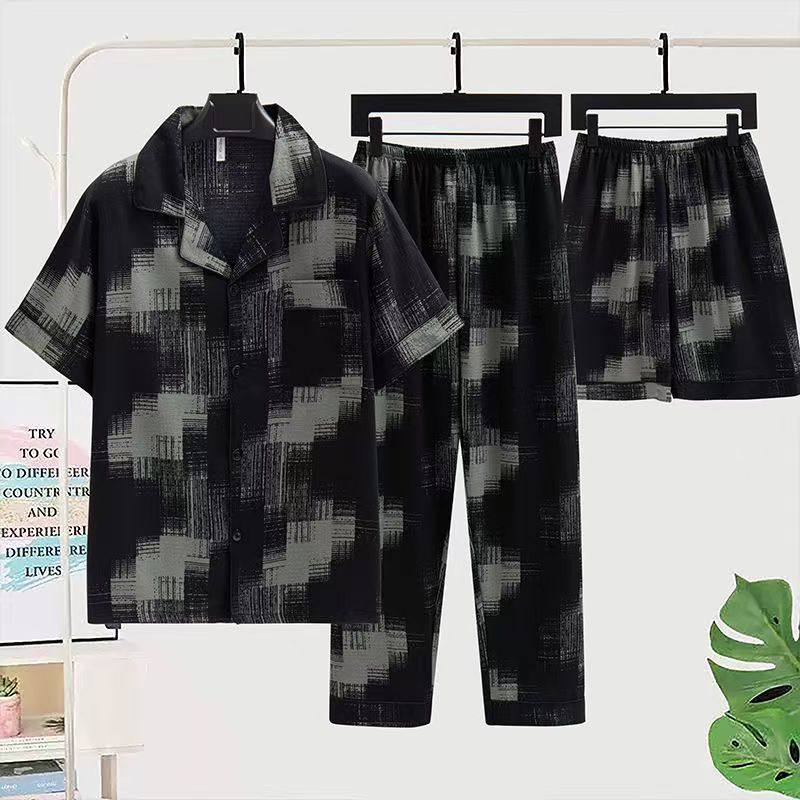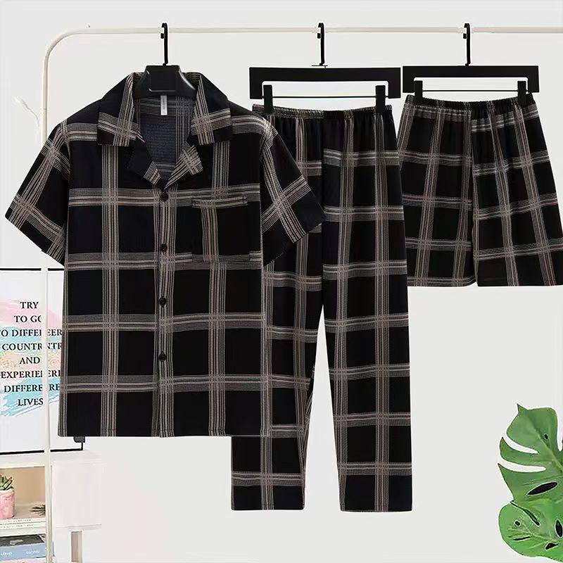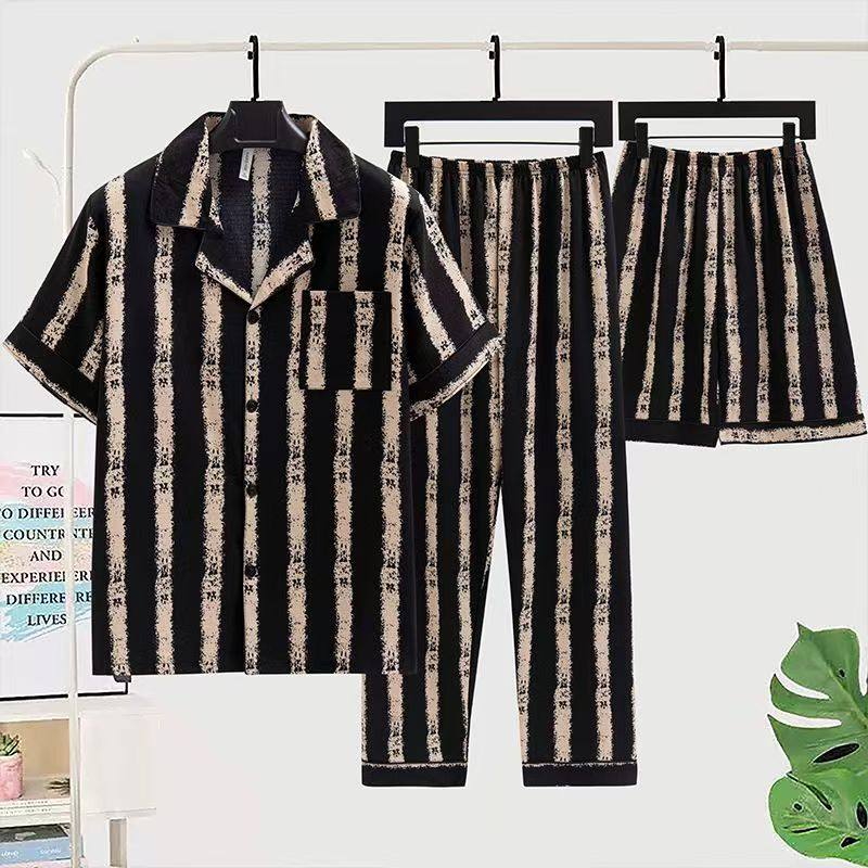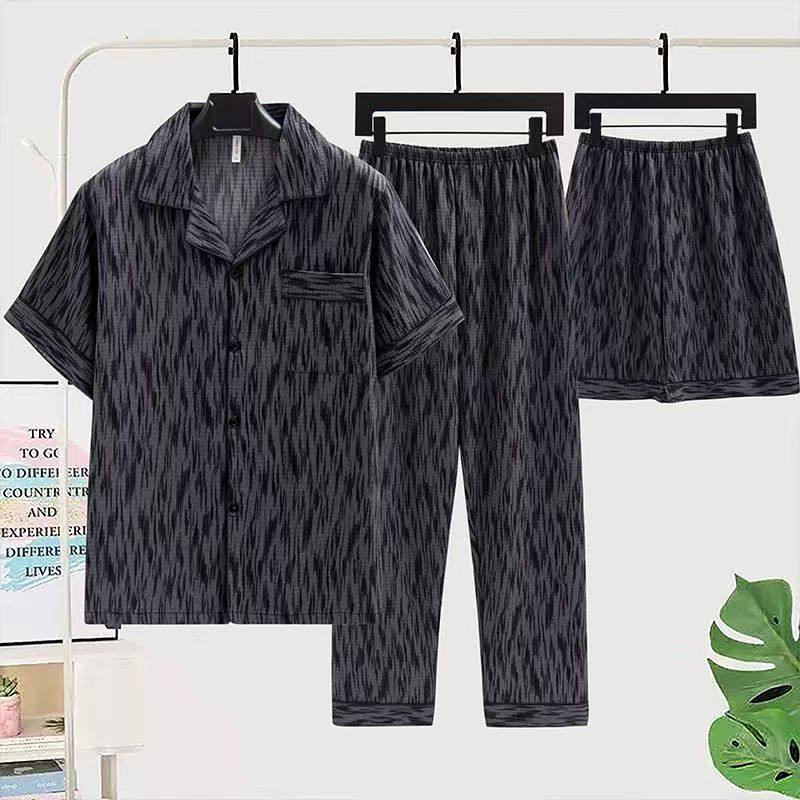 男生夏季男士睡衣开衫纯棉大码薄款短袖短裤男款长裤家居服三件套