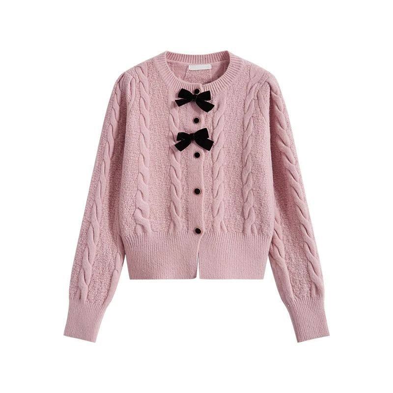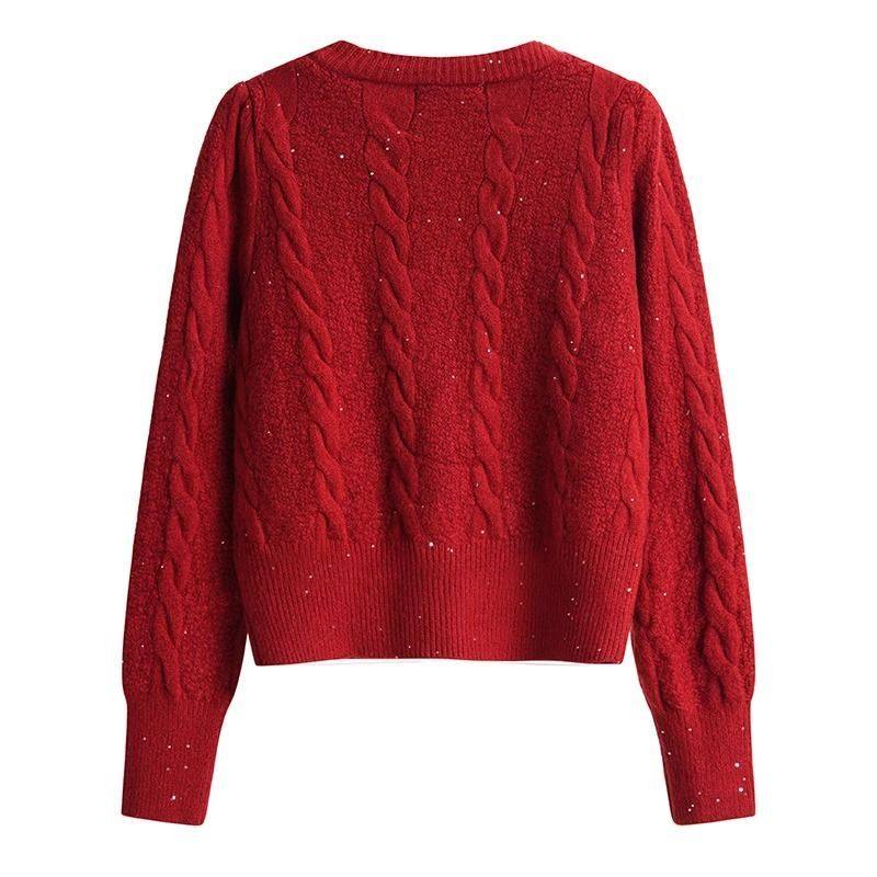 法式气质小香风蝴蝶结红色针织衫2025秋冬新款大码内搭麻花毛衣