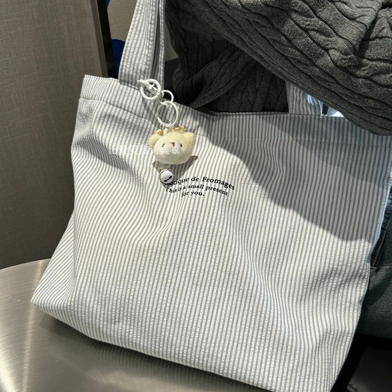 条纹单肩帆布包女大学生上课包包上班通勤托特包大容量手提购物袋
