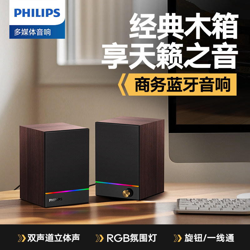 飞利浦木质音响蓝牙高音质电脑台式机笔记本家用桌面迷你有线两用