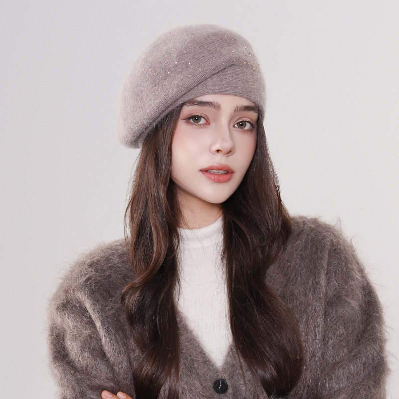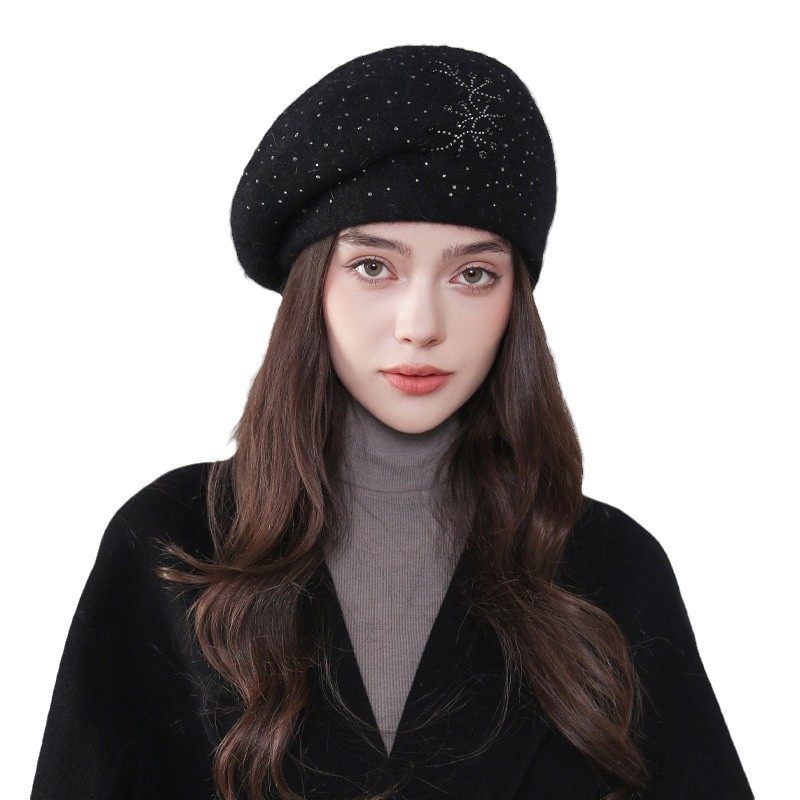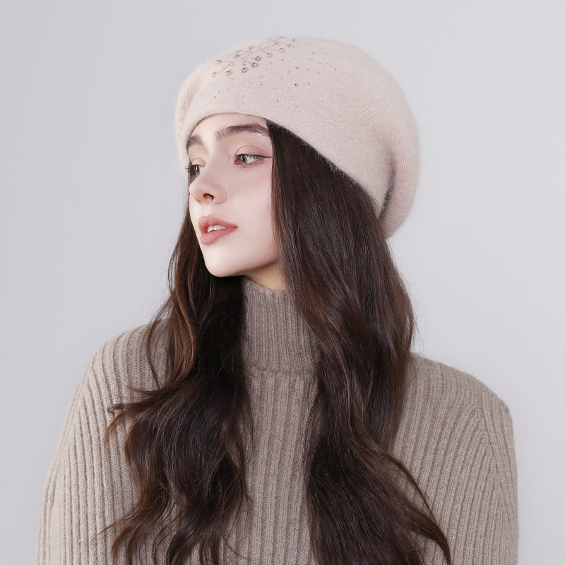 秋冬新款兔毛帽子女高级感贝雷帽冬季防风保暖针织毛线帽黑色白色
