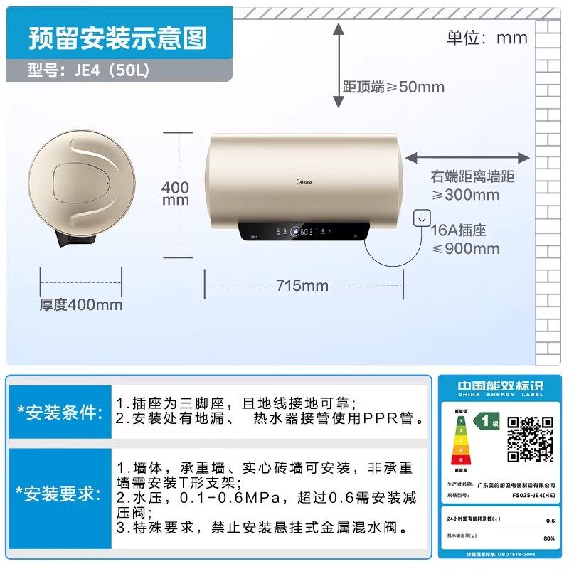 美的电热水器60升50升80升电家用洗澡卫生间一级能效免换镁棒JE4