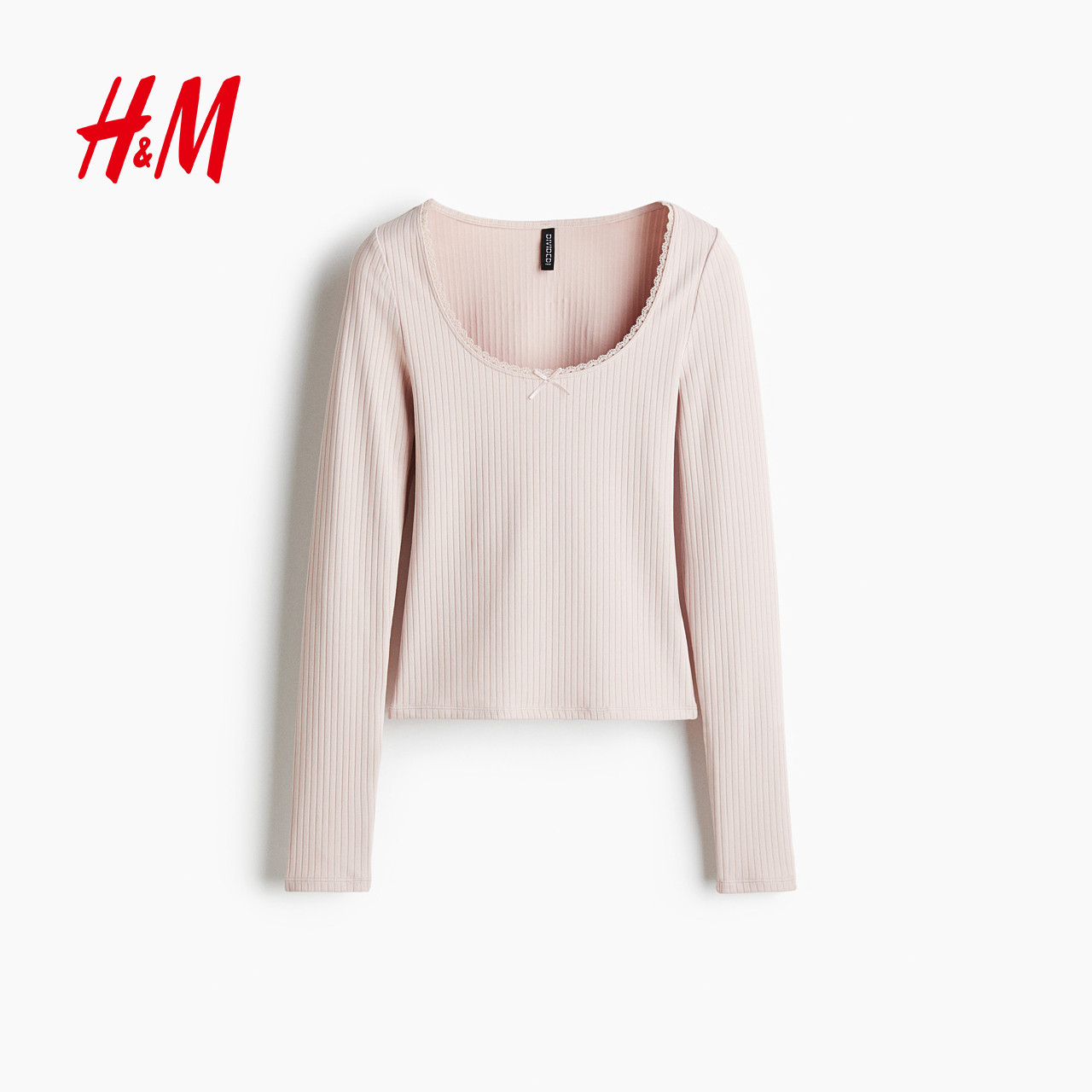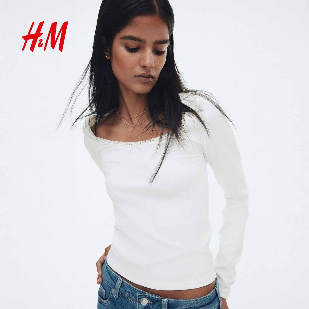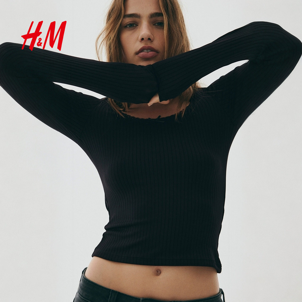 HM女装T恤2025新款蕾丝边低领口修身打底长袖酒红色短上衣1296048