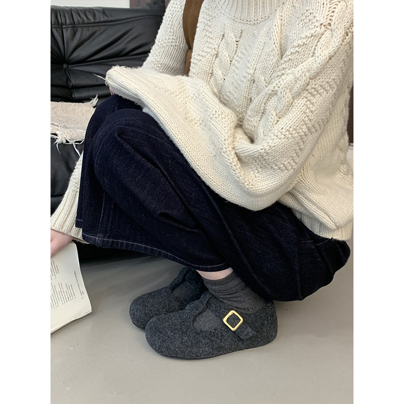 羊皮版复古玛丽珍鞋女方头秋冬季加绒保暖毛毛棉鞋平底晚晚单鞋女