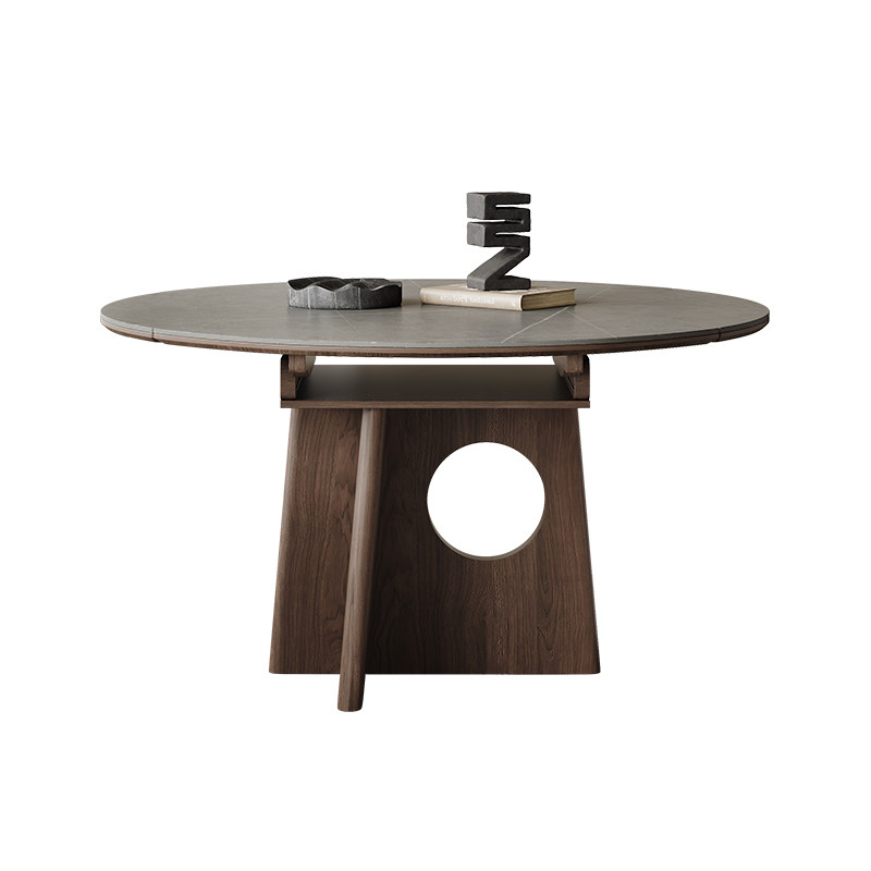 实木伸缩餐桌侘寂中古风家用圆桌北欧意式高端胡桃色哑光岩板餐桌