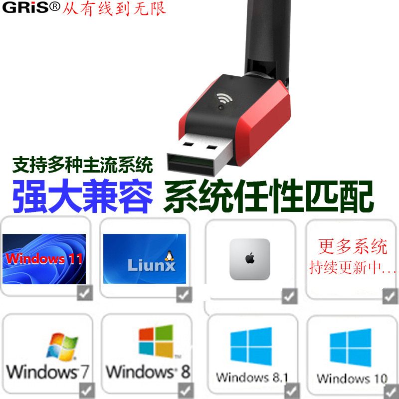GRIS XP win7 8 10 11系统免驱动USB无线网卡台式机笔记本150M电脑wifi接收雷凌MTK7601联发科RTL8188GU瑞昱