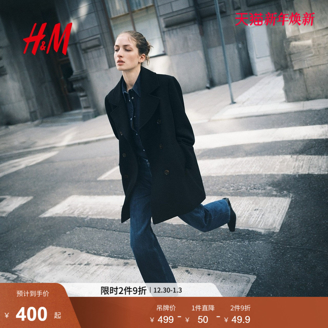 HM女装毛呢外套2025冬新款双排扣英伦风平驳领斜纹布大衣1302223