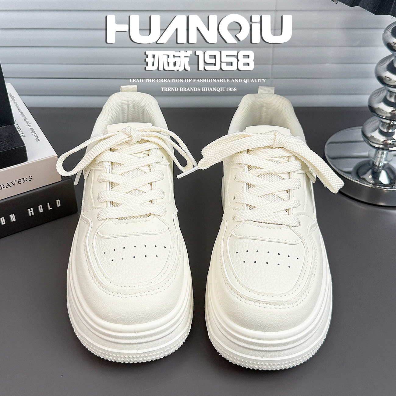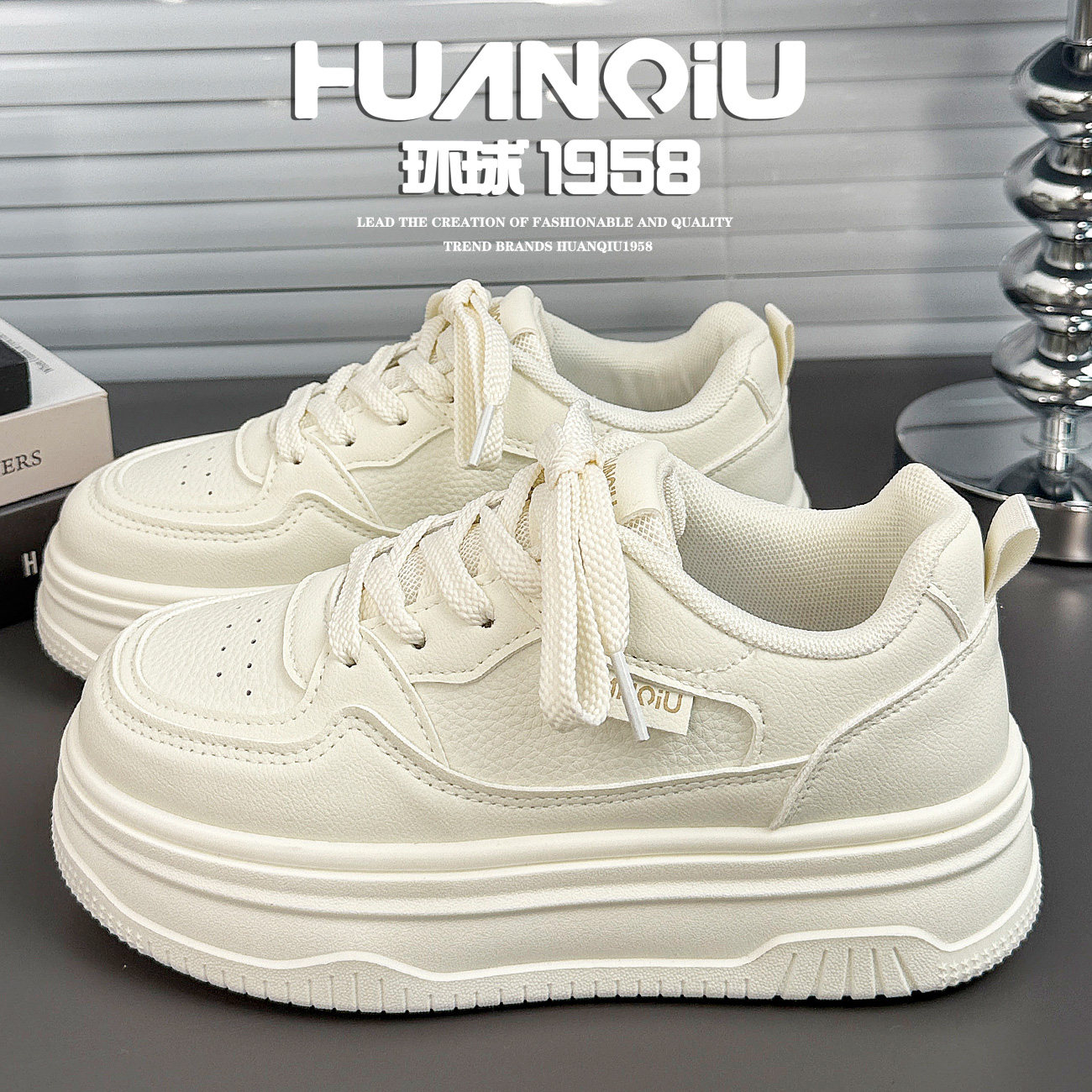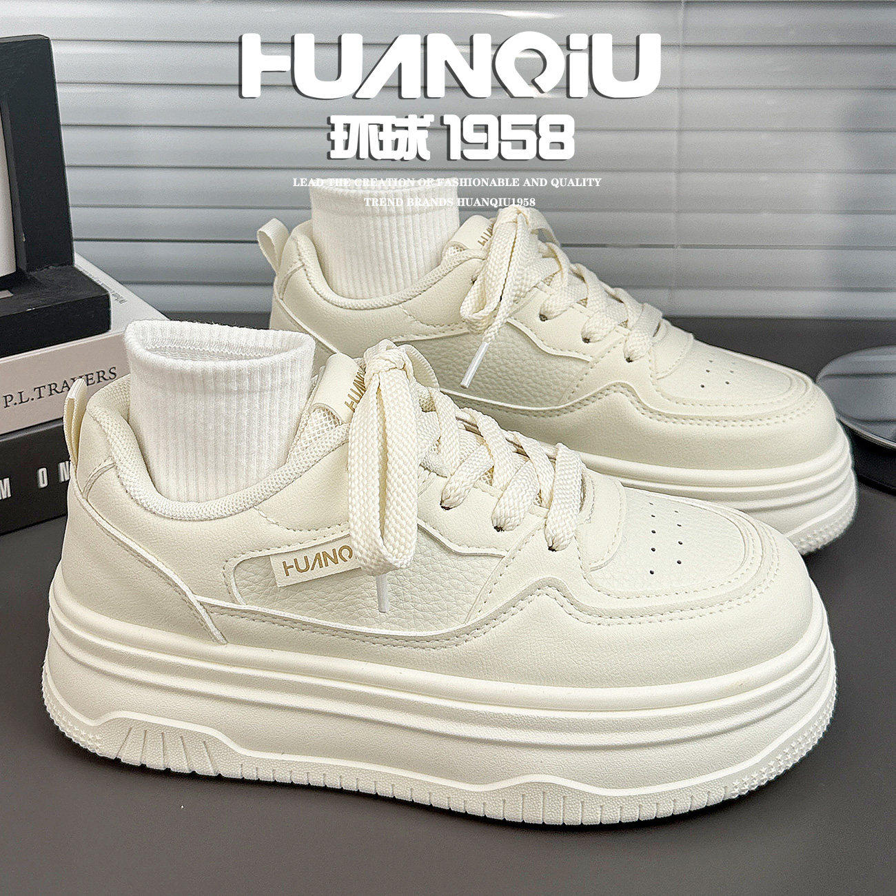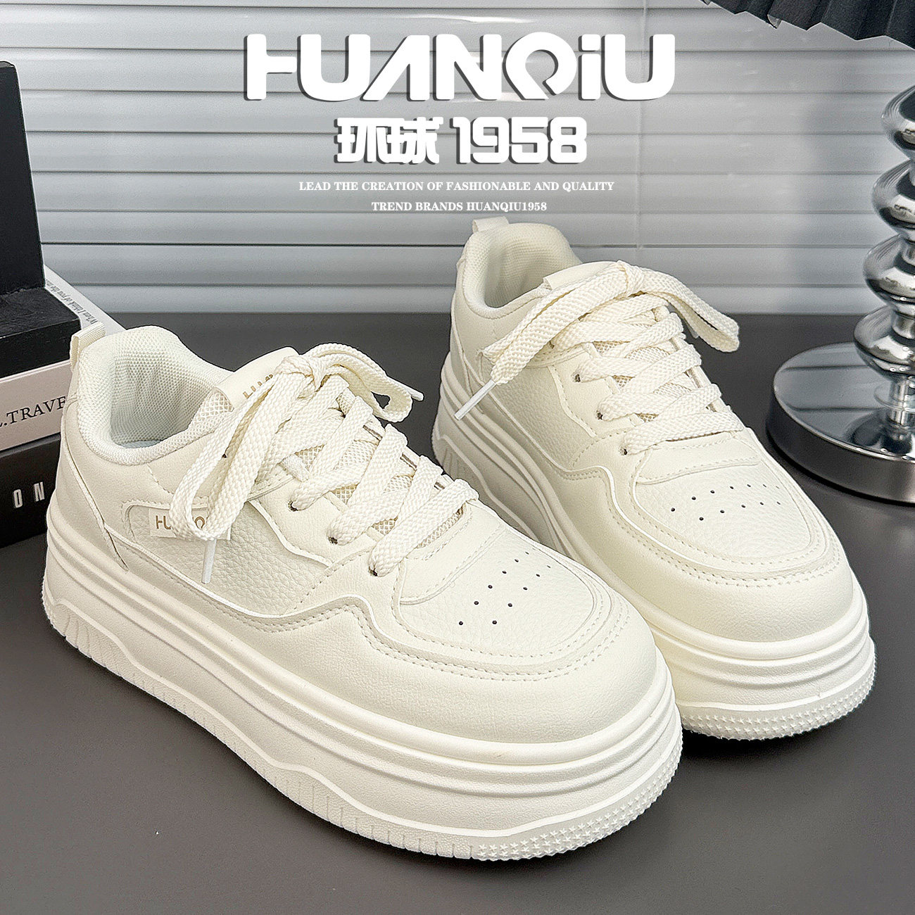 环球厚底米色小白鞋女2026春季新款休闲百搭增高松糕鞋白色系带鞋