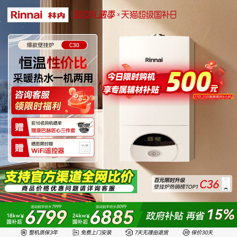 林内燃气壁挂炉家用采暖热水两用天然气洗浴地暖锅炉C30