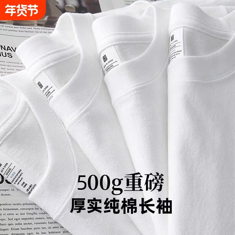 新疆棉400g重磅纯棉长袖t恤秋冬宽松纯白色打底衫内搭加厚男女款