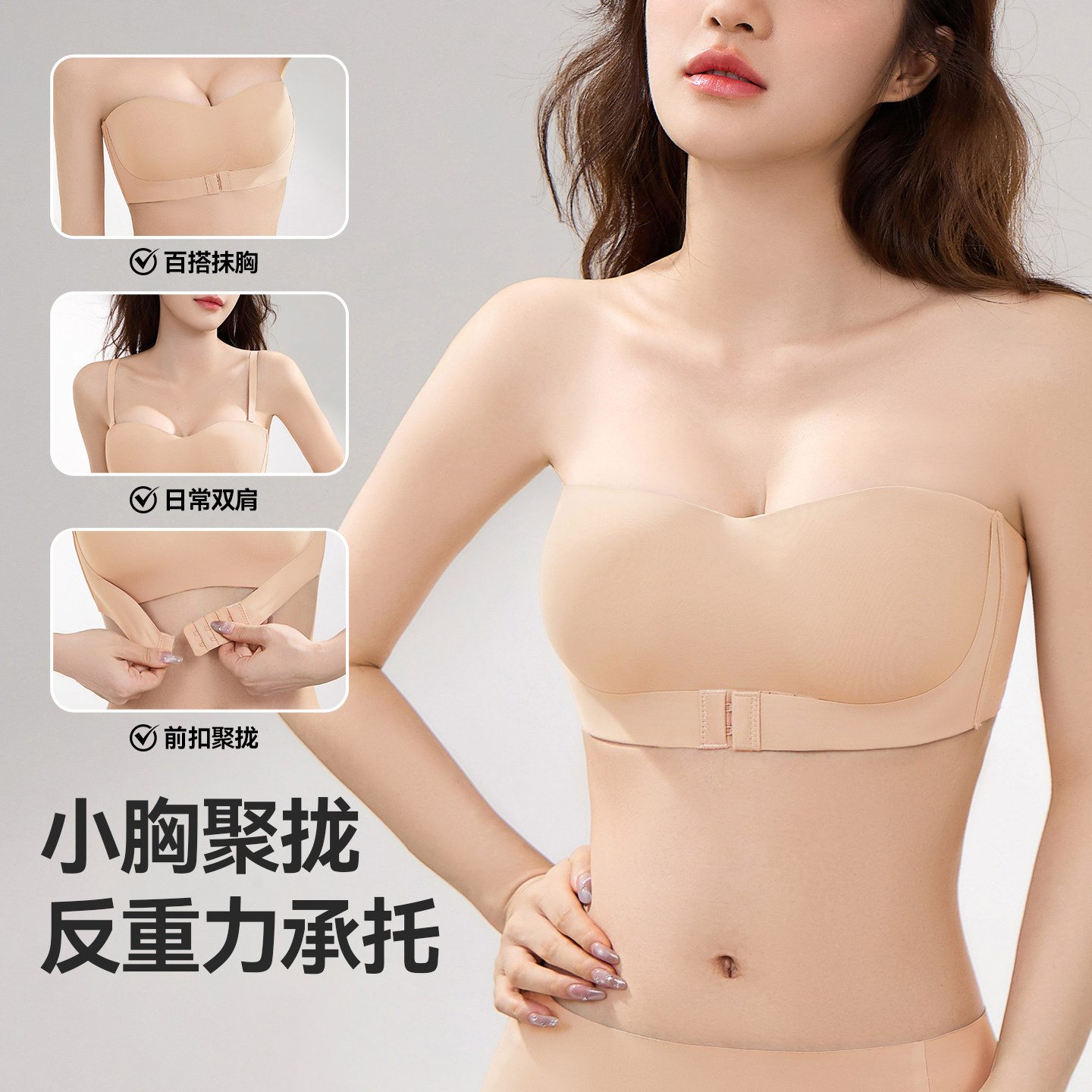 猫人无肩带内衣女小胸显大聚拢裹抹胸收副乳防下垂无痕防滑文胸罩