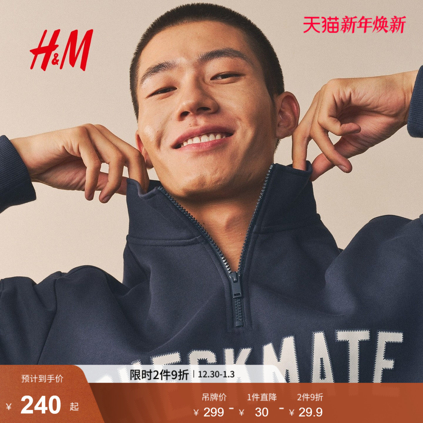 HM男装女装卫衣2025冬季新款重磅美式宽松拉链情侣装套衫1307187