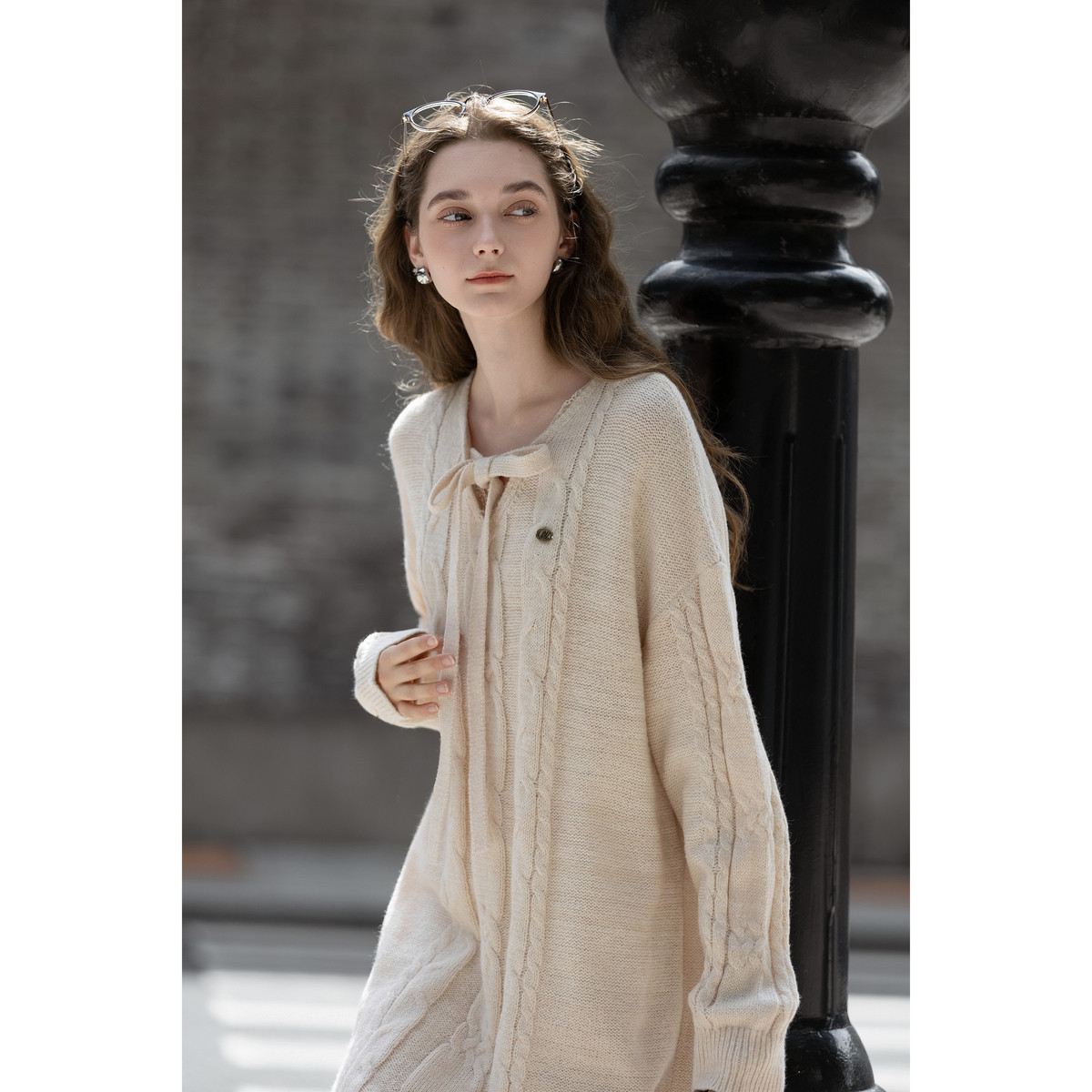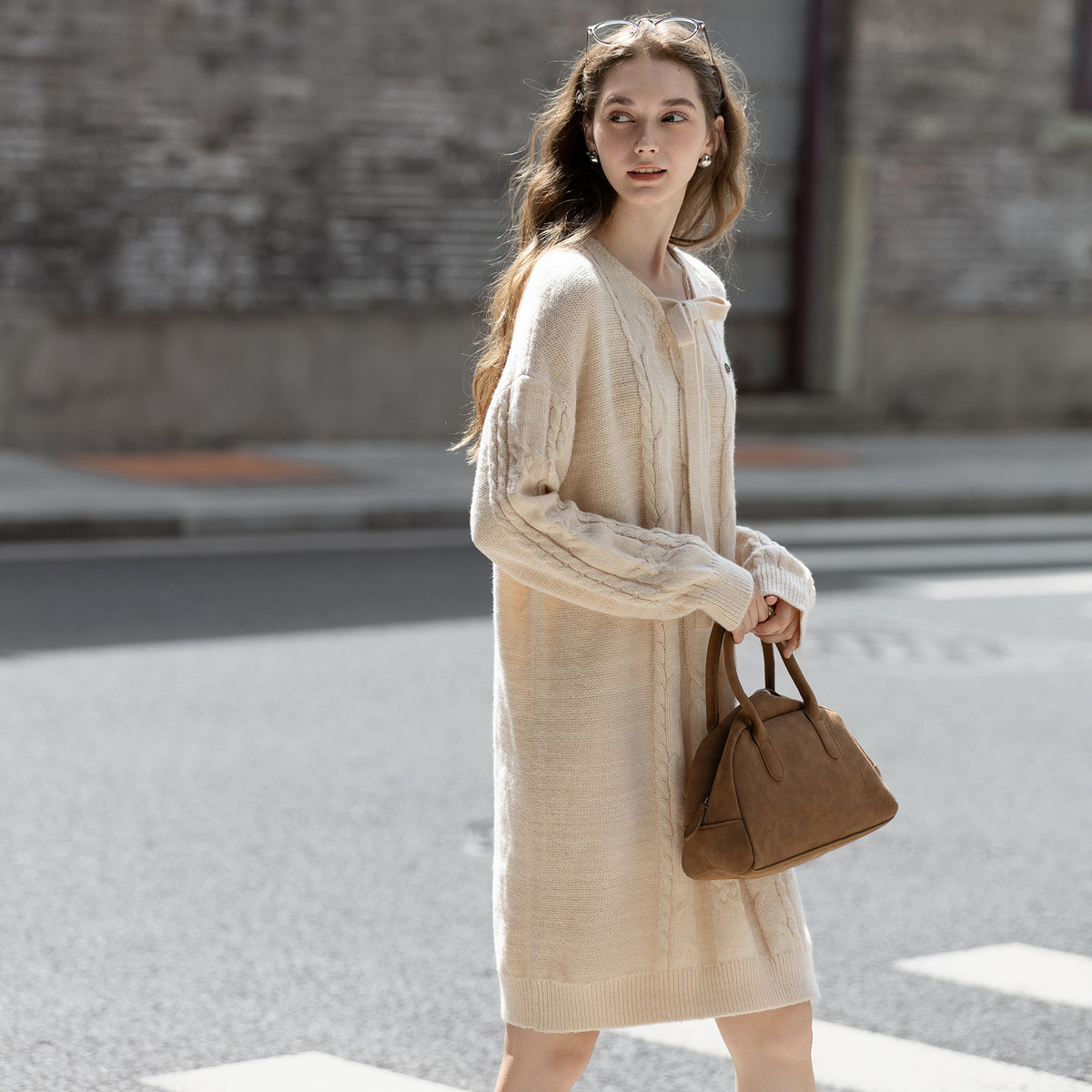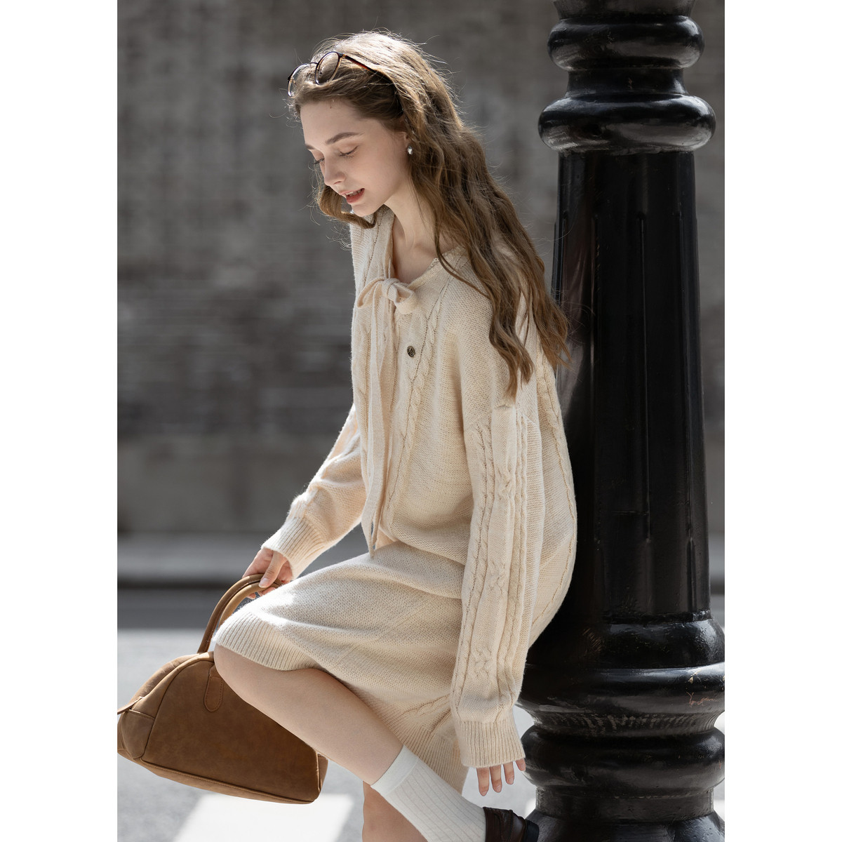 唐狮秋冬季毛衣裙女甜美领口绑带设计感秋季穿搭长袖连衣裙TMTA