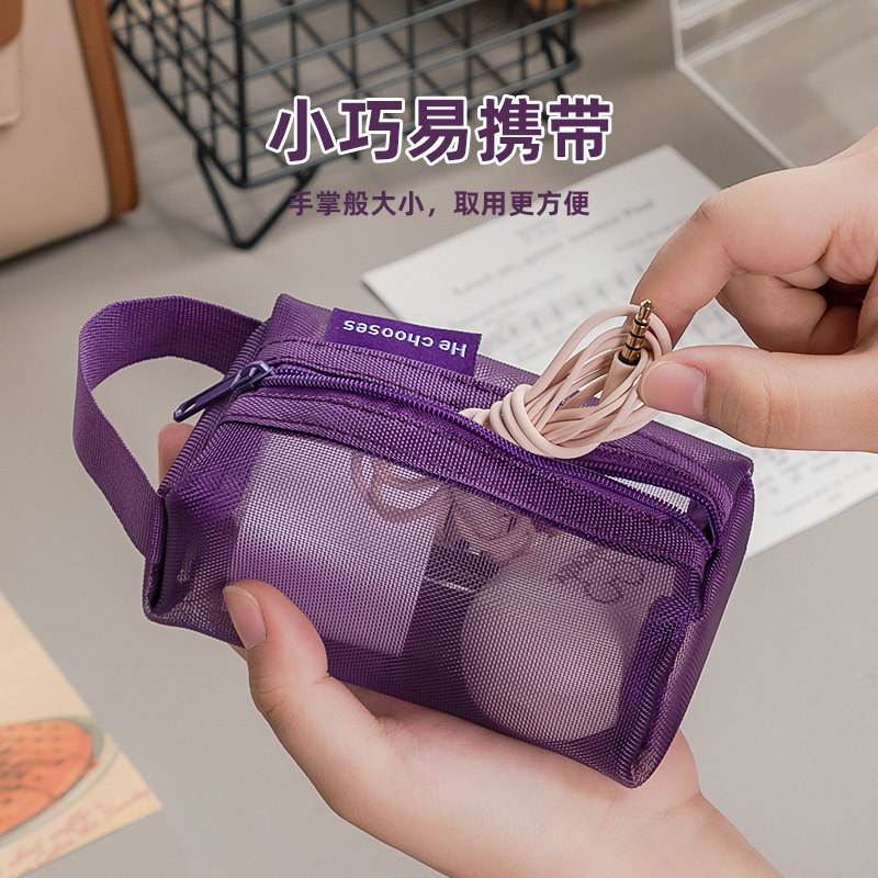 迷你网纱零钱包复古收纳袋便携拉链式小物件钥匙包耳机口红银行卡包透明手提小文具笔袋大容量多功能挂件女
