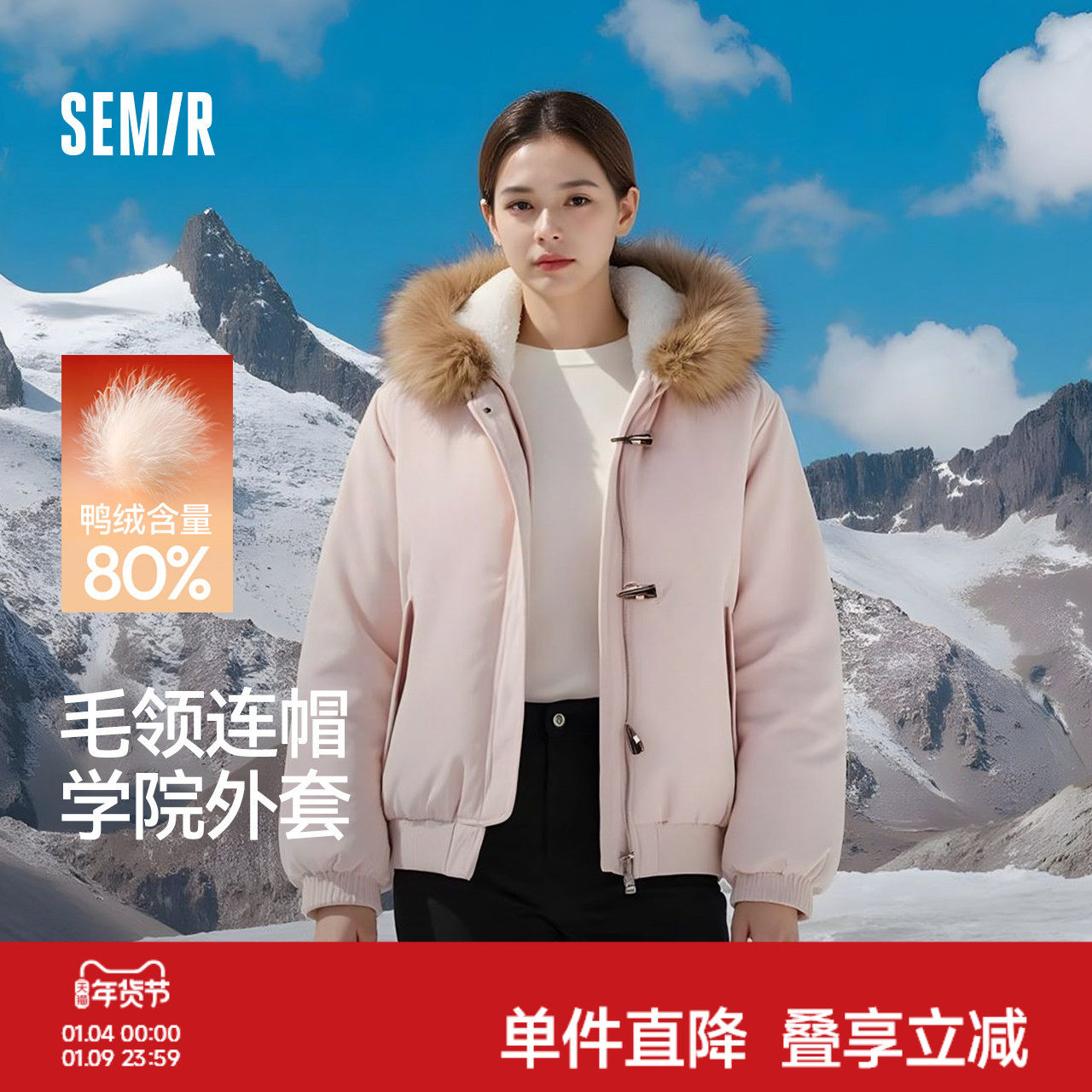 森马羽绒服女冬季可脱卸毛领牛角扣宽松80绒子2025新款学院风外套