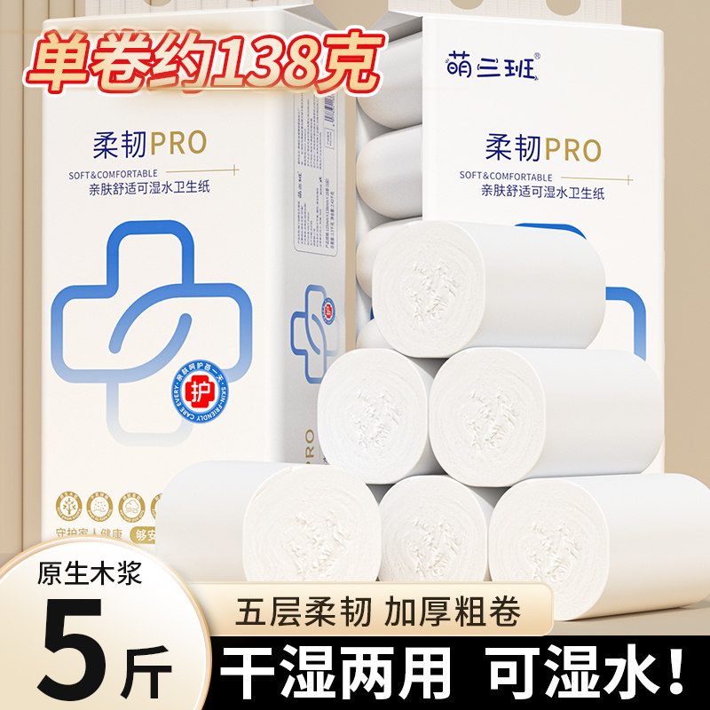 萌三班卫生纸卷纸纸巾实惠装家用整箱5斤大粗5层无芯卷筒厕纸手纸