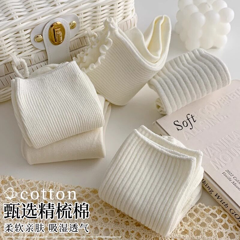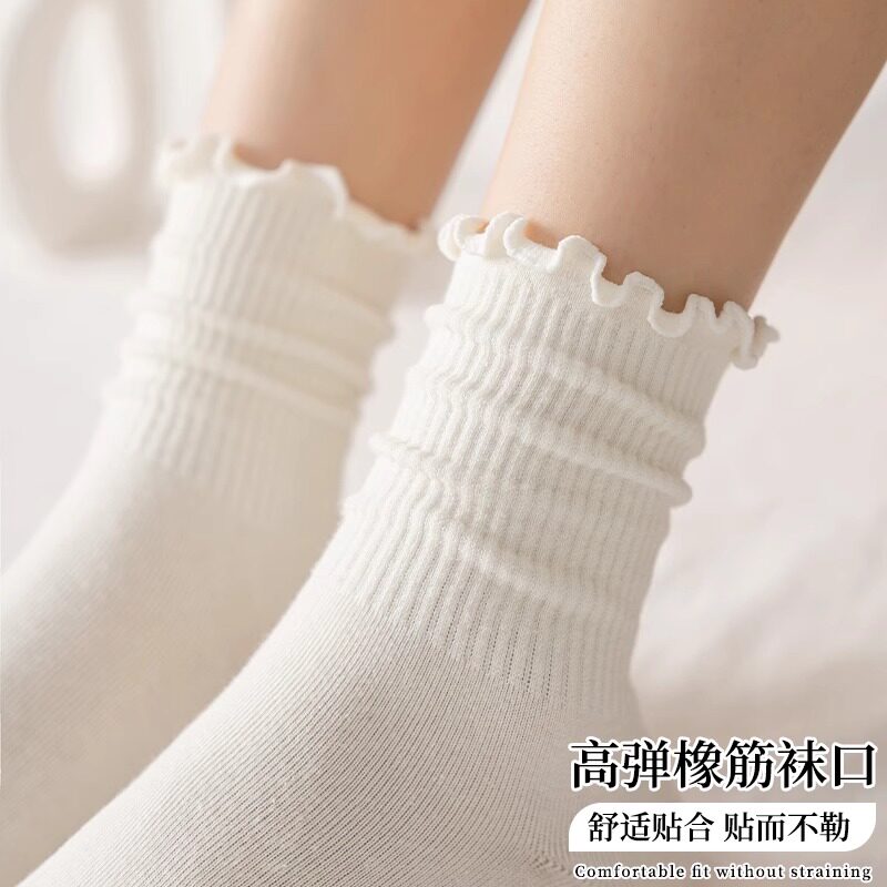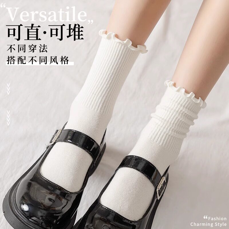 白色堆堆袜子女中筒春秋款配小皮鞋纯棉秋冬木耳边长筒无骨月子袜