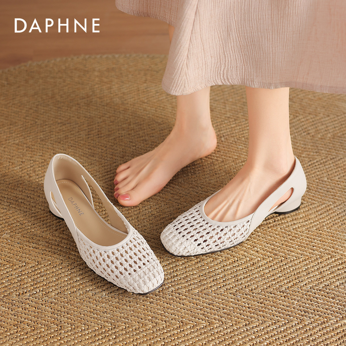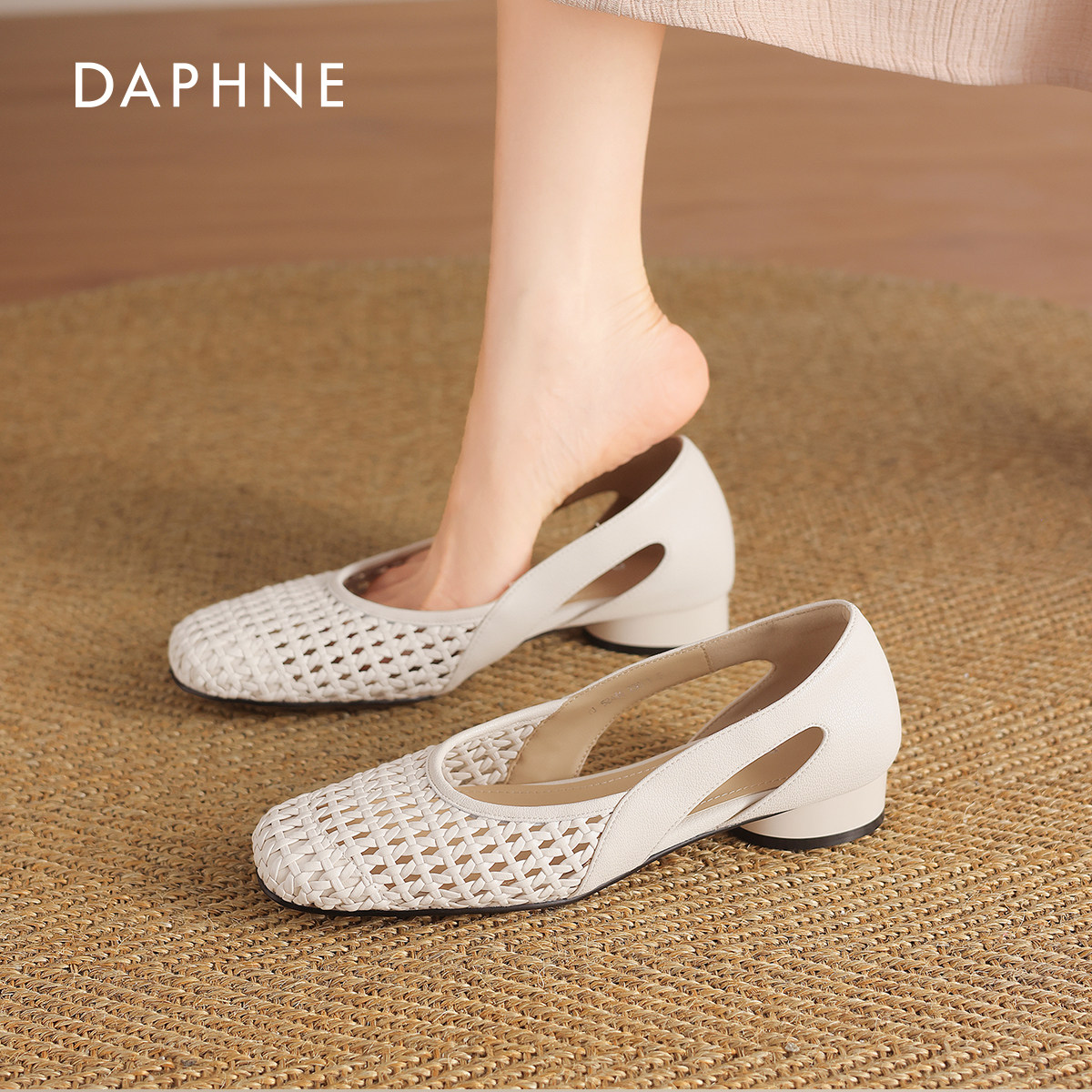 达芙妮粗跟编织凉鞋女2026新款法式镂空包头单鞋通勤浅口平底船鞋