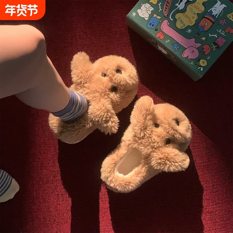 细细条 包跟可爱狗狗棉拖鞋男女冬少女心情侣防滑保暖居家毛毛鞋