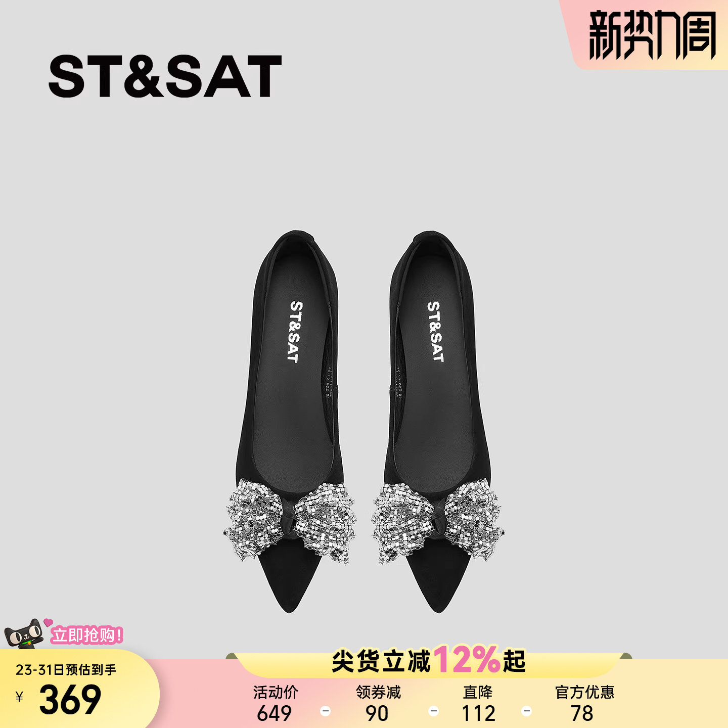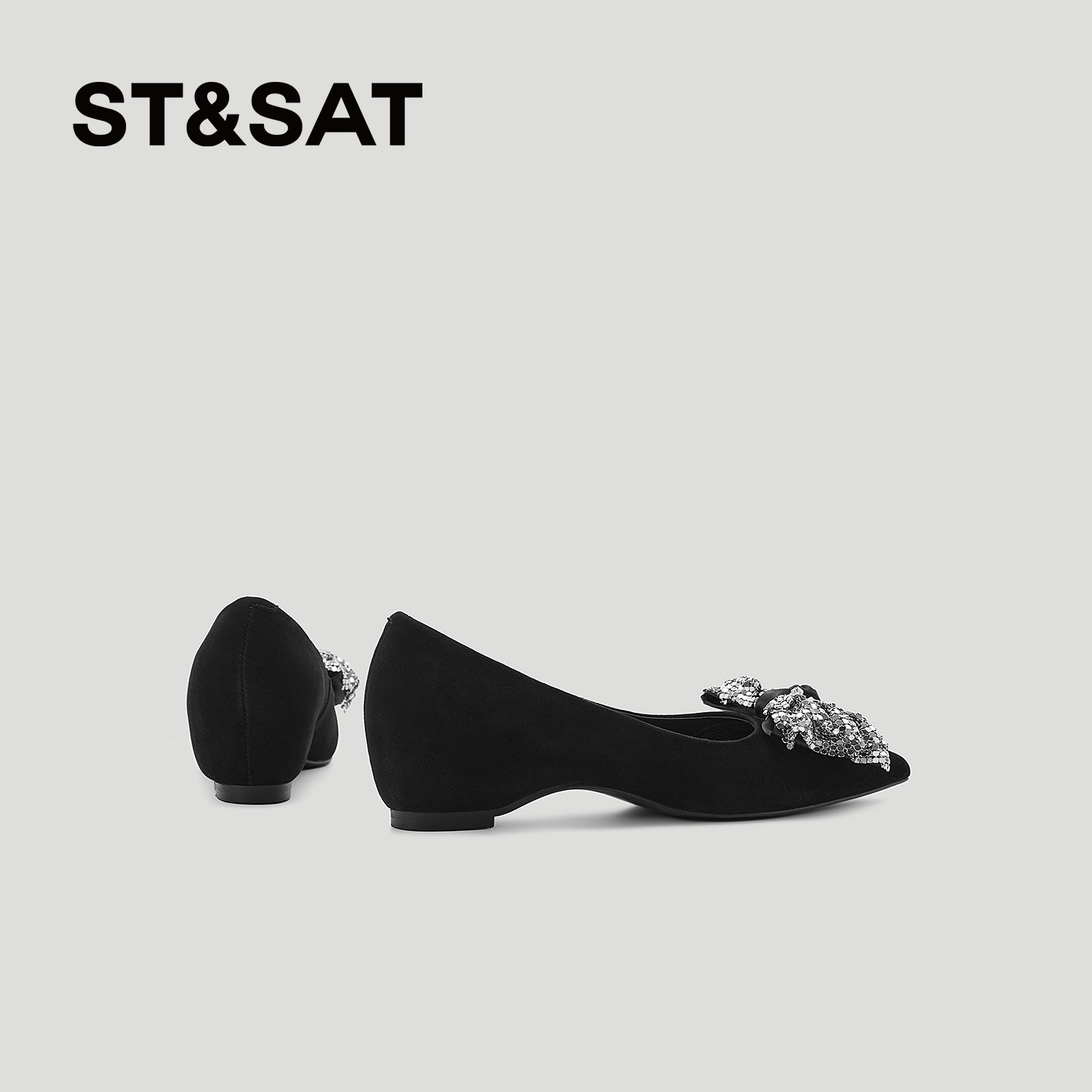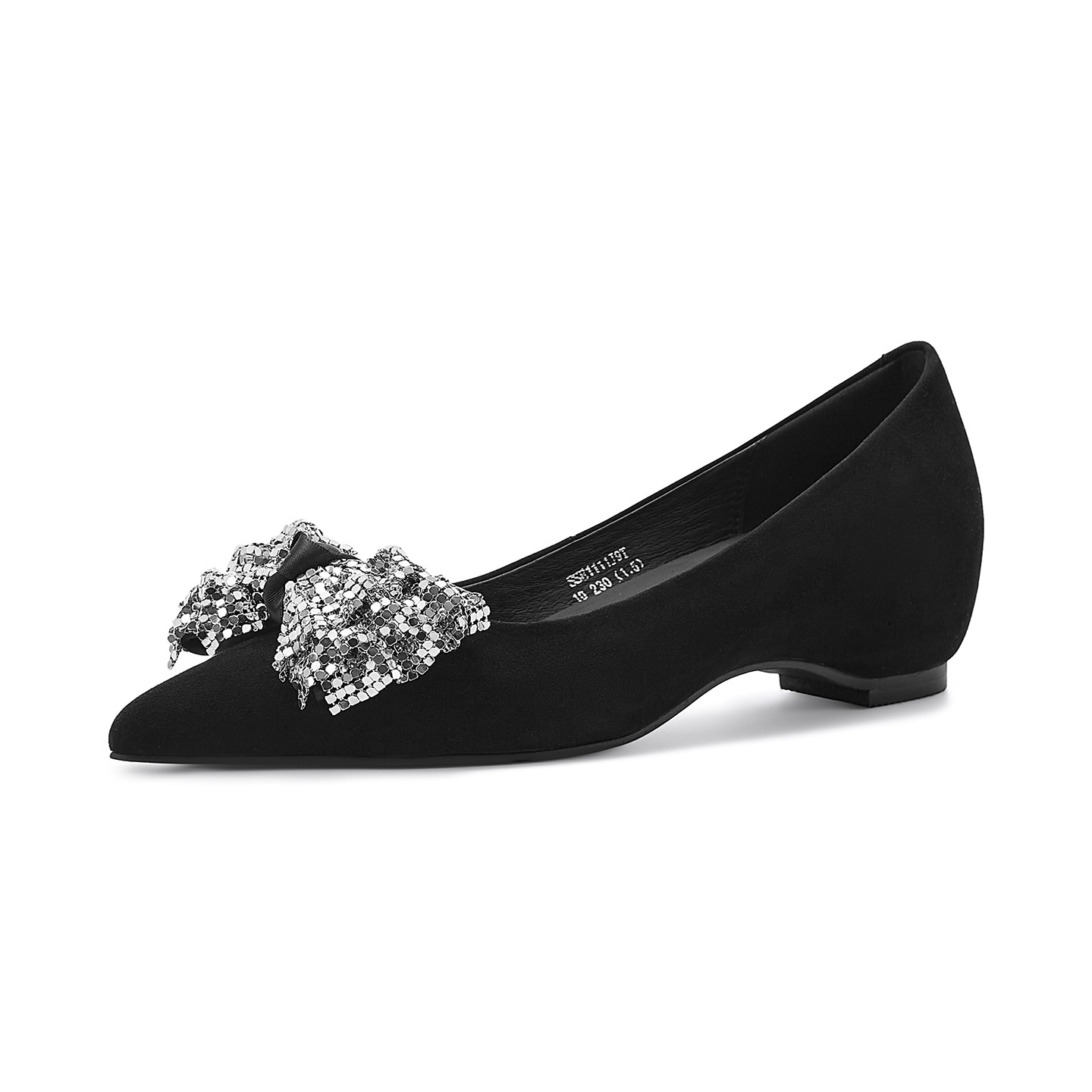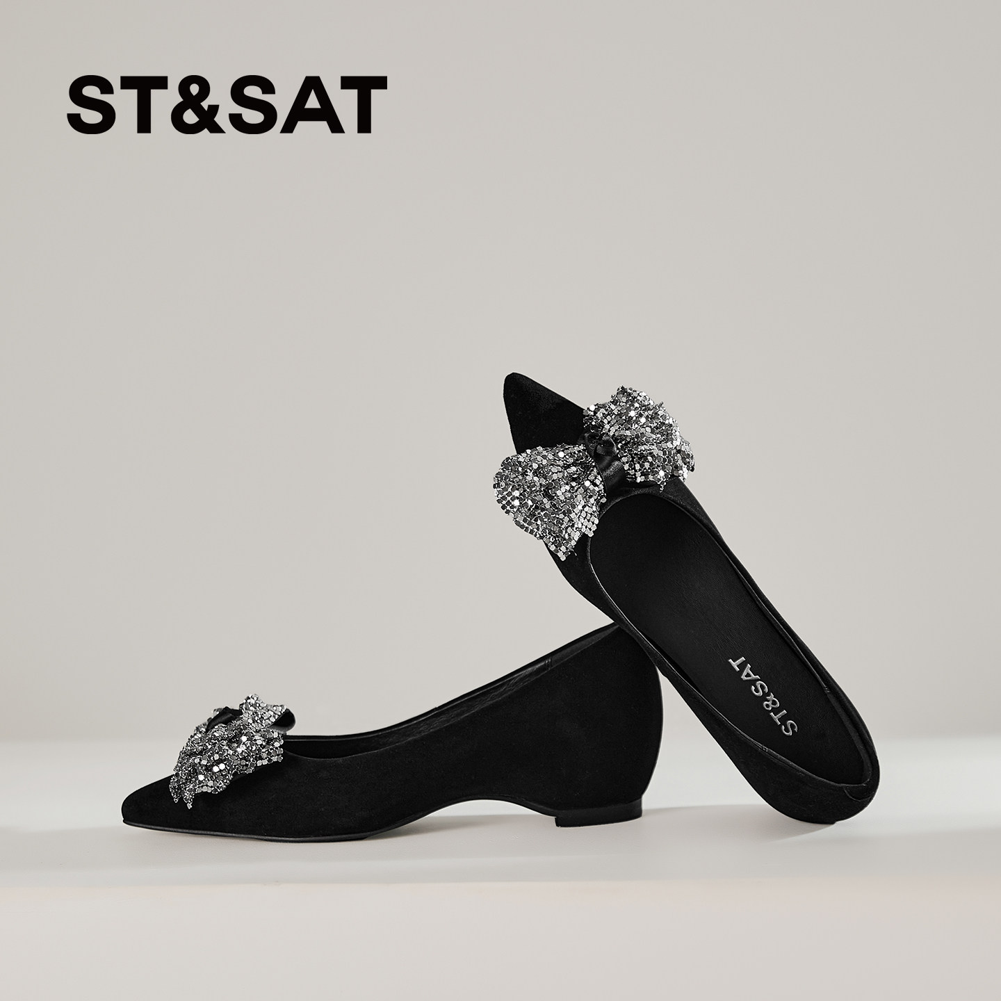 星期六亮片蝴蝶结浅口单鞋女2026新款黑色真皮尖头内增高软底女鞋