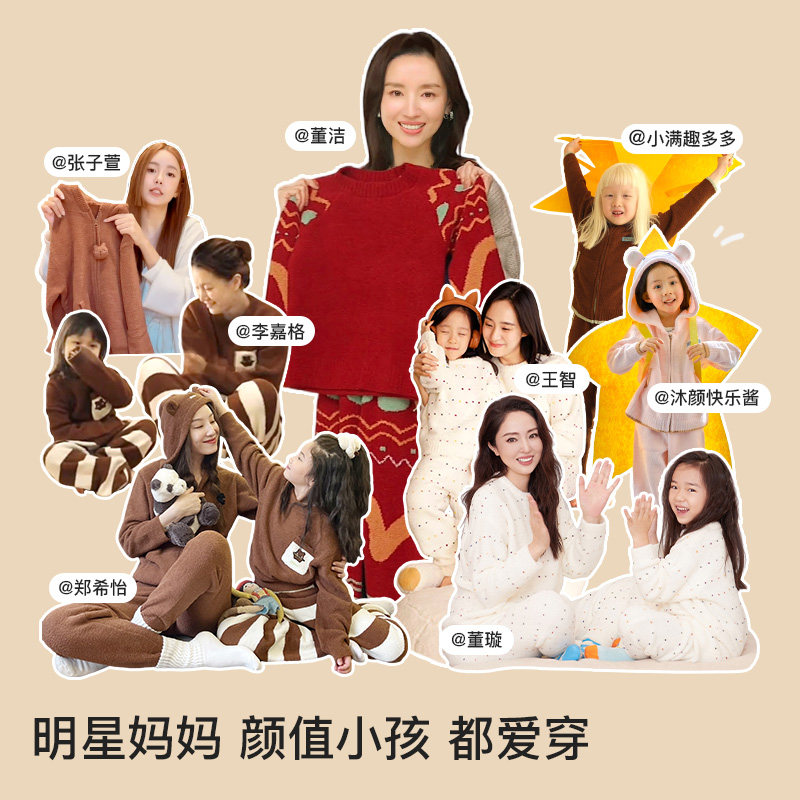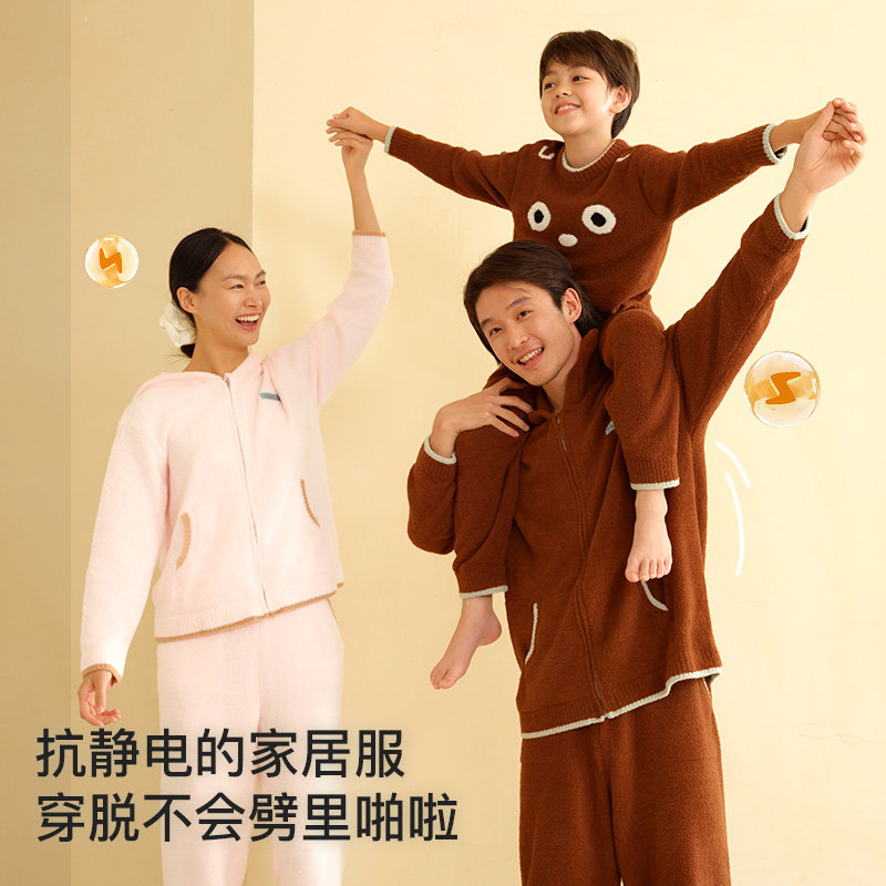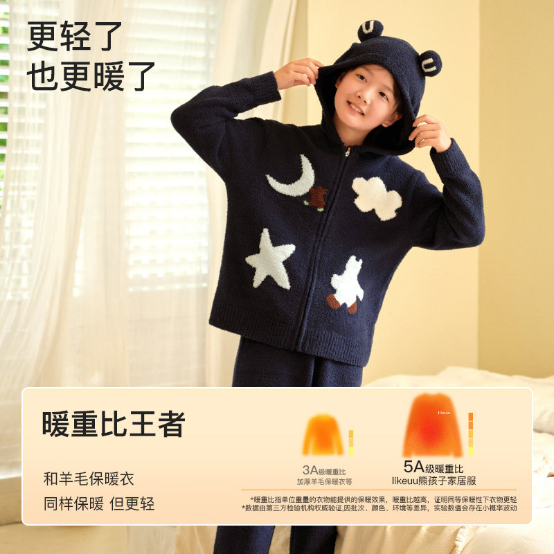 ubras旗下儿童睡衣套装男女大童秋冬小熊半边绒连帽亲子款家居服