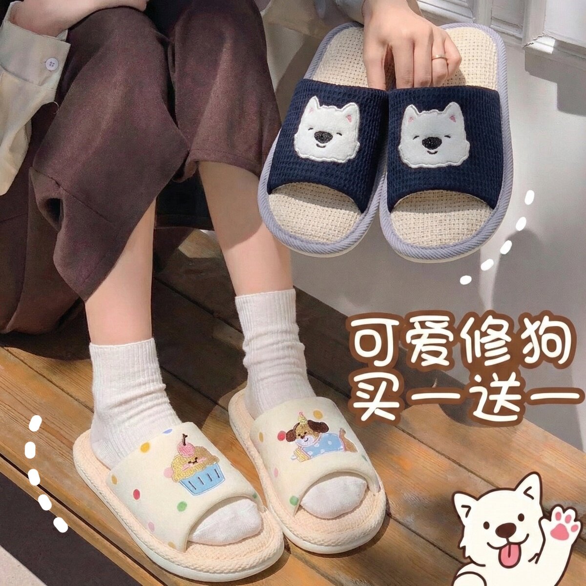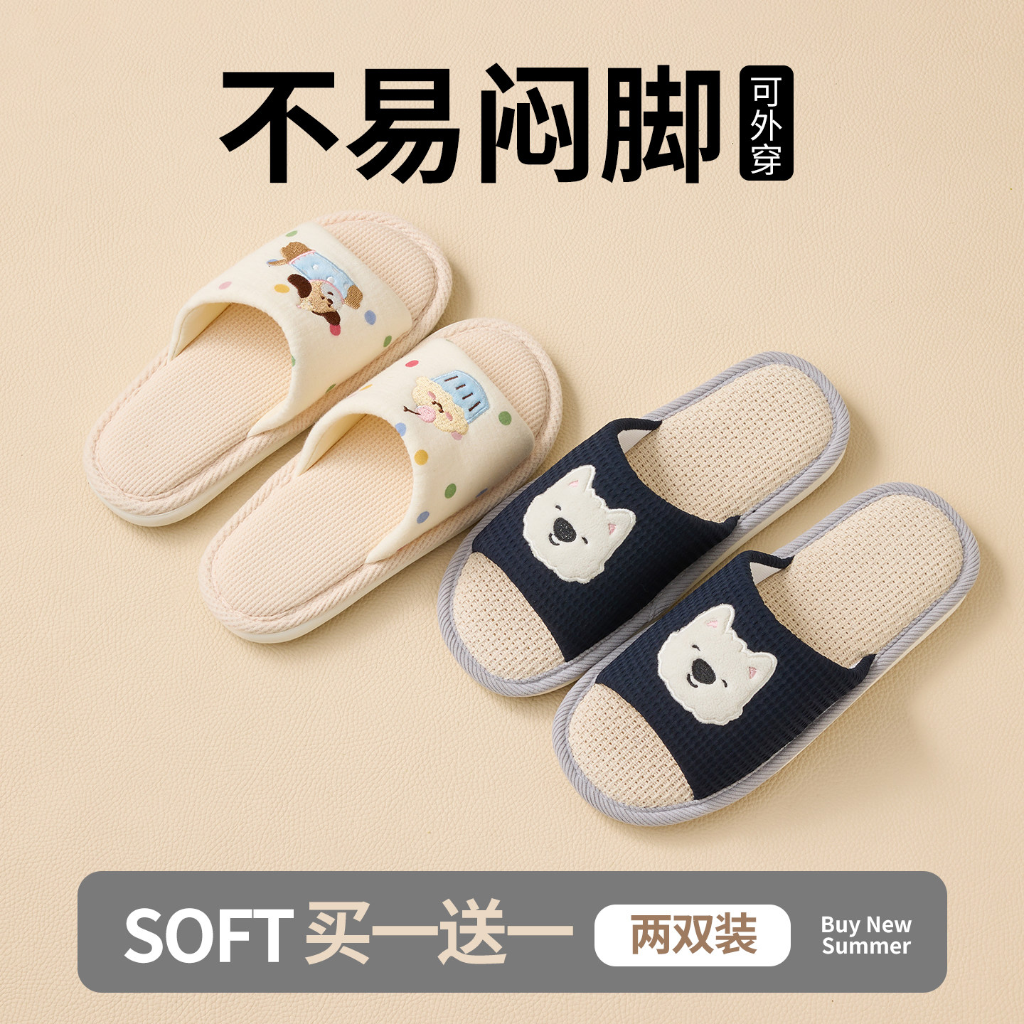 买一送一亚麻拖鞋女可爱2026新款情侣家居防滑棉麻布男士防臭吸汗